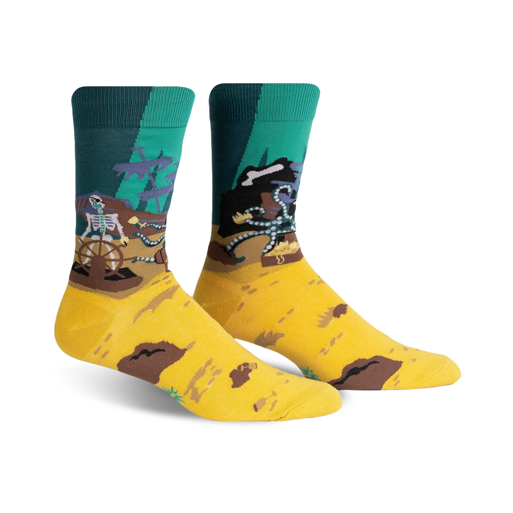 Look what washed ashore! Skeleton Crew socks: there's nothing like a pair of swashbuckling skeletons to add a splash of adventure to your feet. "Shiver me timbers!" They'll exclaim, "Walk the plank, matey!" They might even offer you a treasure map to your next great adventure! Ahoy there, matey, don't miss out on these jolly-good socks. So go ahead, sail the seven seas, explore new worlds, and make a splash in Skeleton Crew socks today.