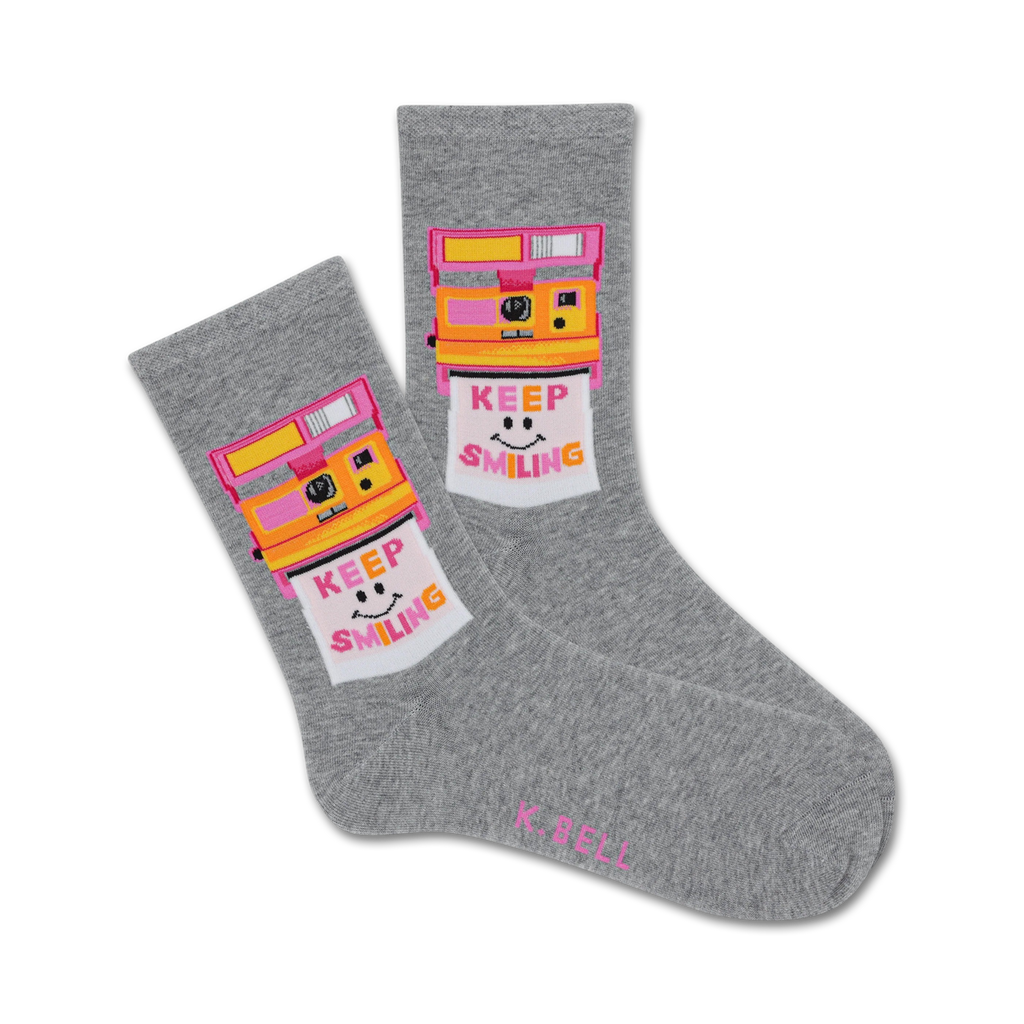 Keep smiling with your feet! No matter what life throws your way, our gray women's crew socks with Polaroid cameras and "Keep Smiling" printed on them will remind you to see the bright side even on your toughest days. Show off your optimism and photography passion with every step. Fun fact: Did you know Polaroids were invented in 1937? So, these socks are retro and funky!
