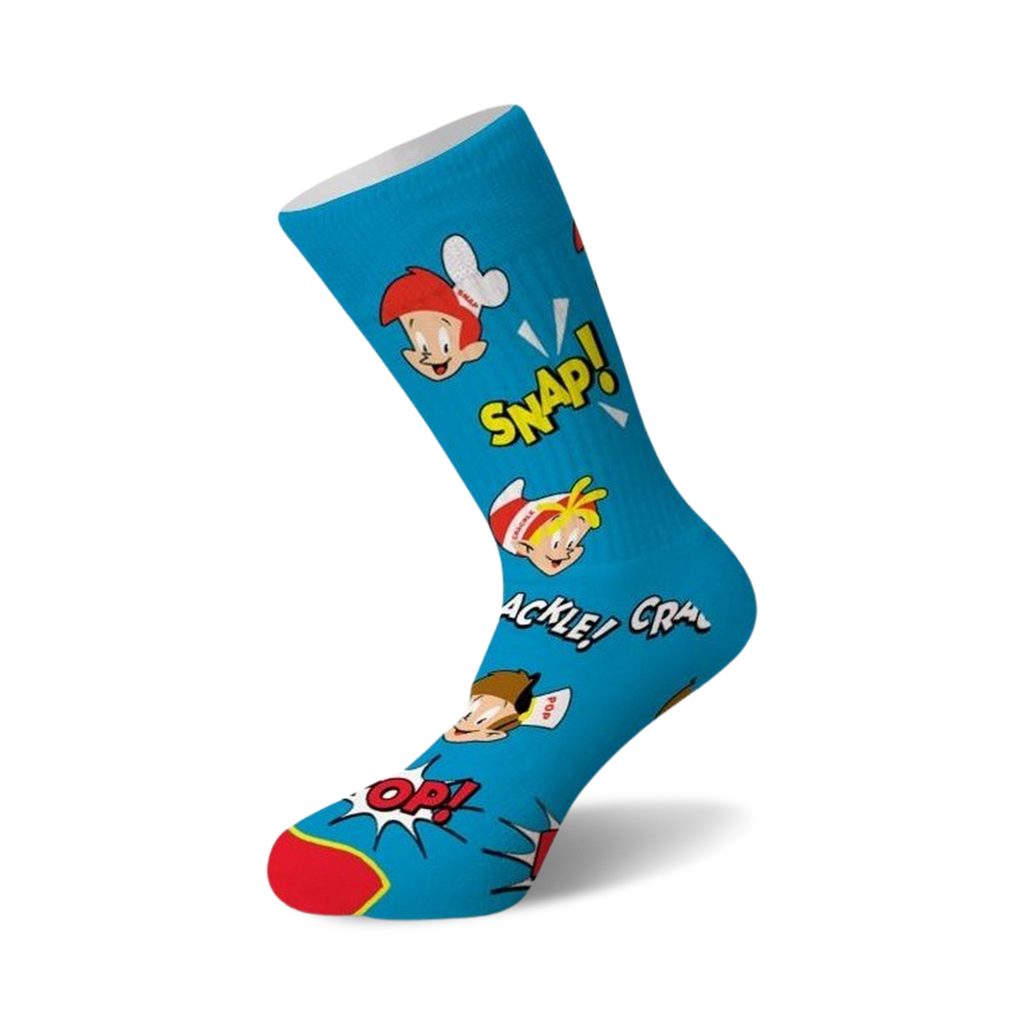 Snap your fingers, crack a smile, and pop your feet into these Rice Krispies socks. Representing your favorite breakfast cereal, these blue socks feature a pattern of Snap, Crackle, and Pop, plus a red toe and heel with a white top. With their iconic Rice Krispies characters, these comfy crew socks are great for breakfast, lunch, and dinner.