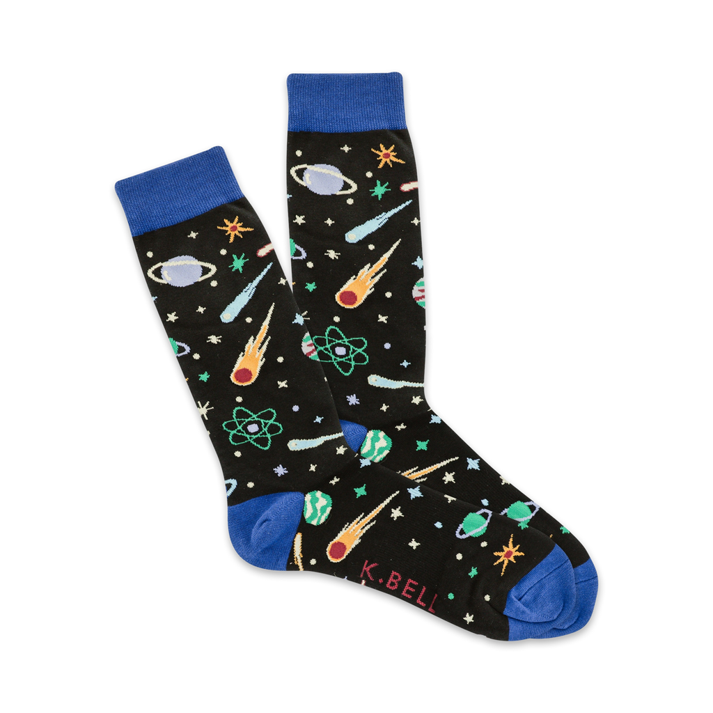 Blast off into space with Space socks, the dynamic socks with planets, stars, comets, and atoms in a vibrant blue and black color scheme. Put on these cosmic crew socks and prepare for an out-of-this-world experience. They're the perfect accessory for any space enthusiast. Go ahead, take a trip to the cosmos, one sock at a time!
