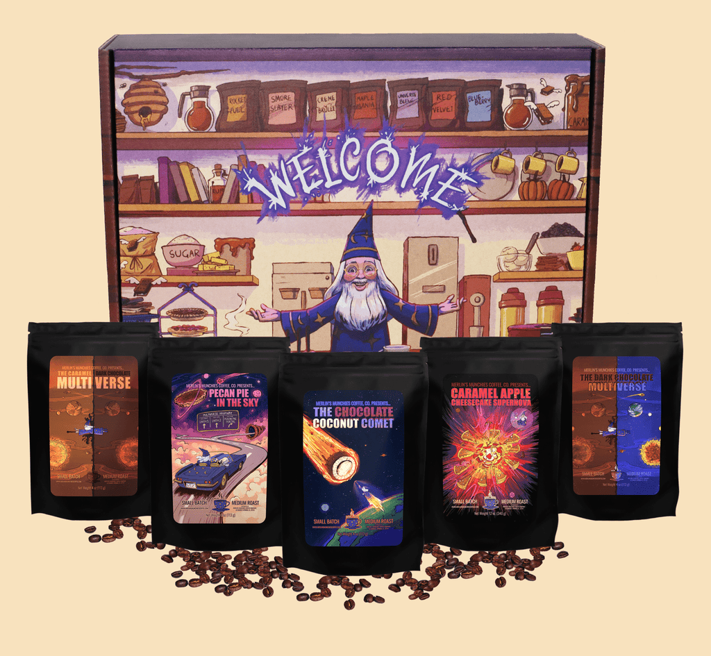 Experience space the way you never have before! Merlin's Space Bundle Box has flavors that will catapult you into another dimension! Venture deep into the Multiverse or experience a Caramel Apple Cheesecake Supernova explosion. Feel free to take the Pecan Pie Portal to the Pecan Pie in the sky. Want more??... Well, there's a Chocolate Coconut Comet hurling towards Earth! Merlin Help!