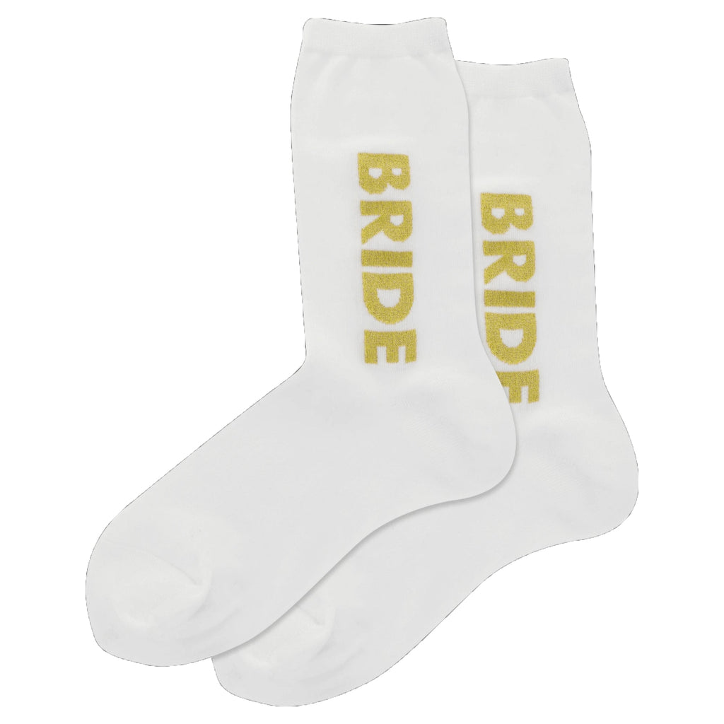 Say 'I do' to these fun socks! They're white crew socks with a gold 'BRIDE' vertically printed on each one. The gold lettering is shown as a sparkly, slightly textured design against the clean white background. Perfect for the big day or just for adding a little sparkle to your everyday look.