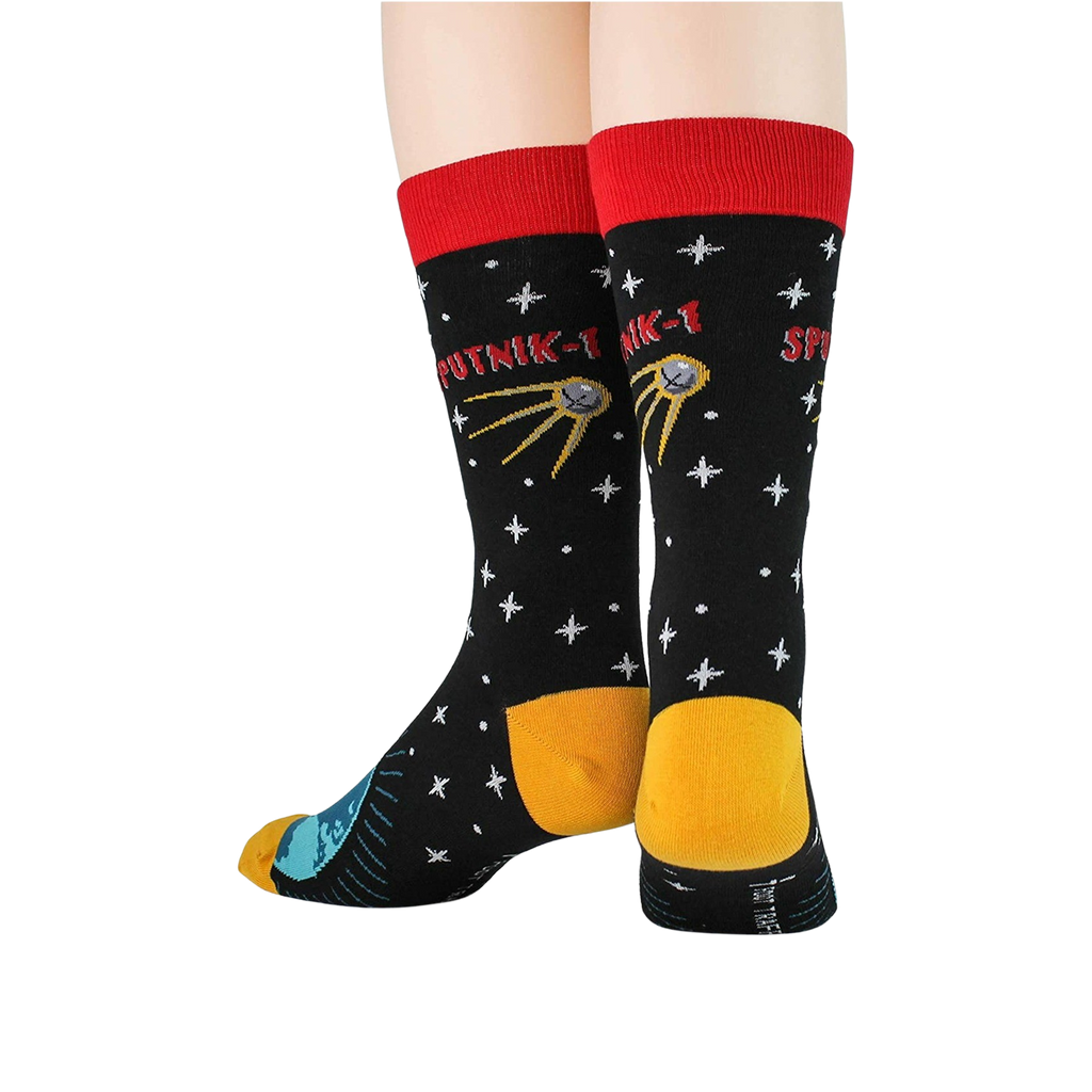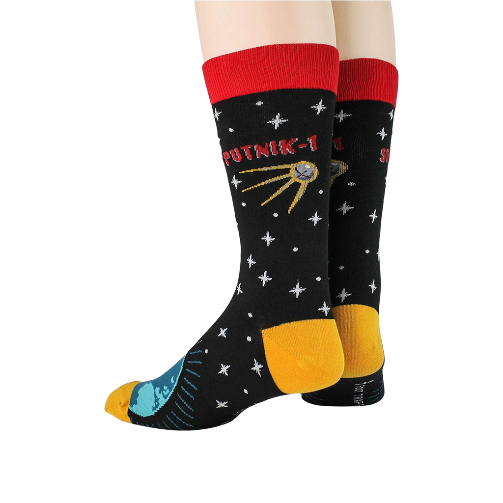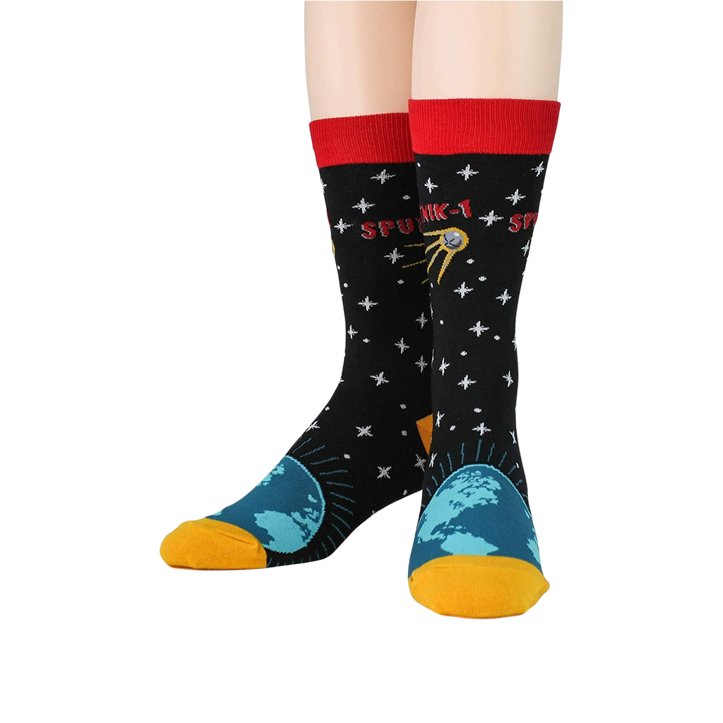 Blast off into the cosmos with our Sputnik Socks! They'll put the solar system right at your feet, featuring a star-spangled sky, Earth, and even a Sputnik with a bright, blazing trail. These rocket-powered crew socks will make every step intergalactic.