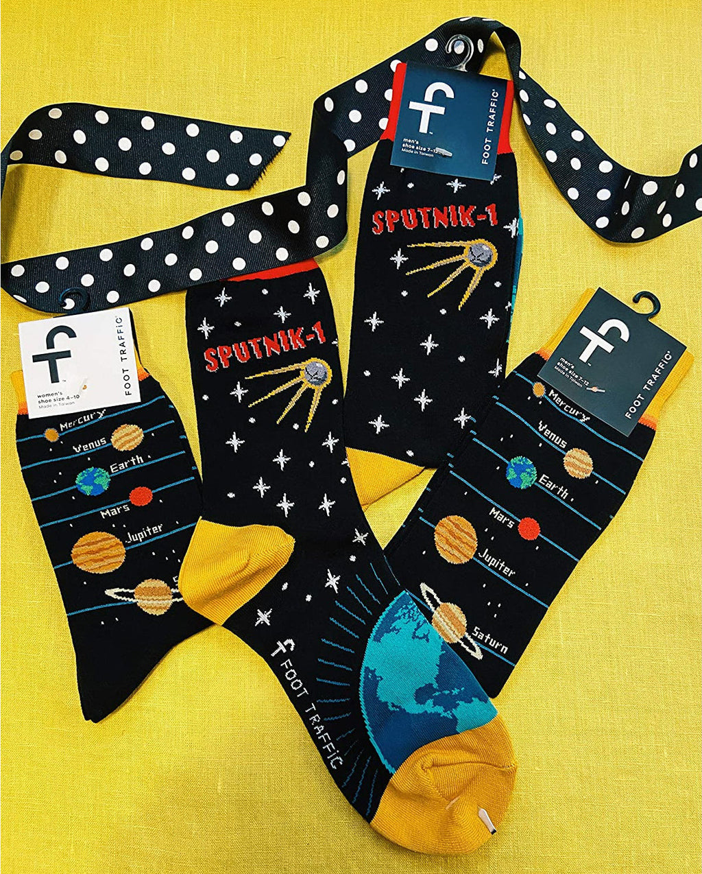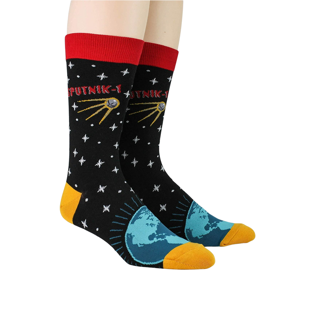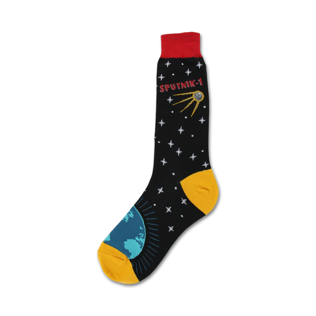 Blast off into the cosmos with our Sputnik Socks! They'll put the solar system right at your feet, featuring a star-spangled sky, Earth, and even a Sputnik with a bright, blazing trail. These rocket-powered crew socks will make every step intergalactic.