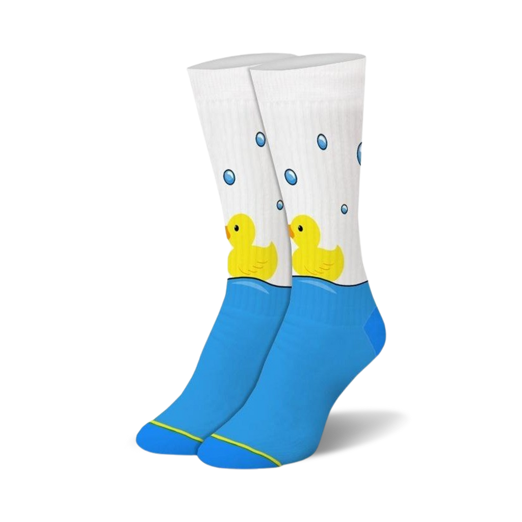 Like a squeaky-clean rubber ducky in a bubbly bathtub, these white socks with a blue water line and yellow rubber duck pattern will have you floating in a sea of compliments. With blue toes, heels, and yellow bands, these crew-length socks for women are perfect for making a splashy statement. Embrace your inner child and let these socks take you on a quack-tastic adventure!