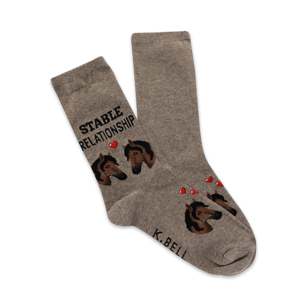 The Stable Relationship socks are as solid as a horse's bond with their rider. The horses, nuzzling each other amidst red hearts, are a symbol of enduring strength. Wear these crew-length socks and feel the love. Perfect for any equine enthusiast or pun aficionado.