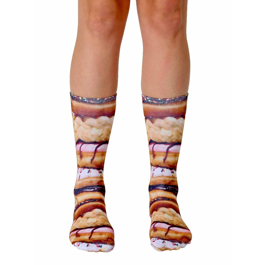 Satisfy your sweet tooth with these Stacked Donut novelty socks! These crew socks for men and women feature a delicious stack of donuts with pink, brown, and white icing with rainbow sprinkles. They're the perfect gift for the donut lover in your life, or anyone who loves fun and unique socks. Fun fact: Did you know that the average person eats about 650 donuts in their lifetime? That's a lot of sweetness! Show off your love for donuts with these tasty socks!