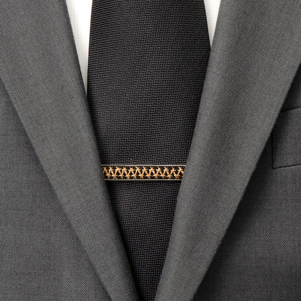 This stainless steel tie clip features beige and black rope, knotted and twisted in an intricate criss-cross design on the face of the clip. Pairs with any of our cufflinks that feature rope around the border.