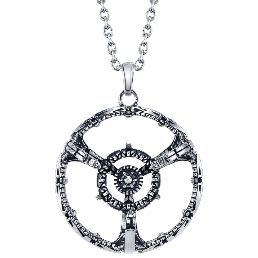 Handcrafted in antiqued sterling silver, this exquisitely detailed three-dimensional miniature Deep Space 9 Station Necklace faithfully captures its distinctive circular design from Star Trek™️: Deep Space Nine. The pendant hangs from an adjustable sterling silver cable chain complete with a lobster clasp and signature tag.