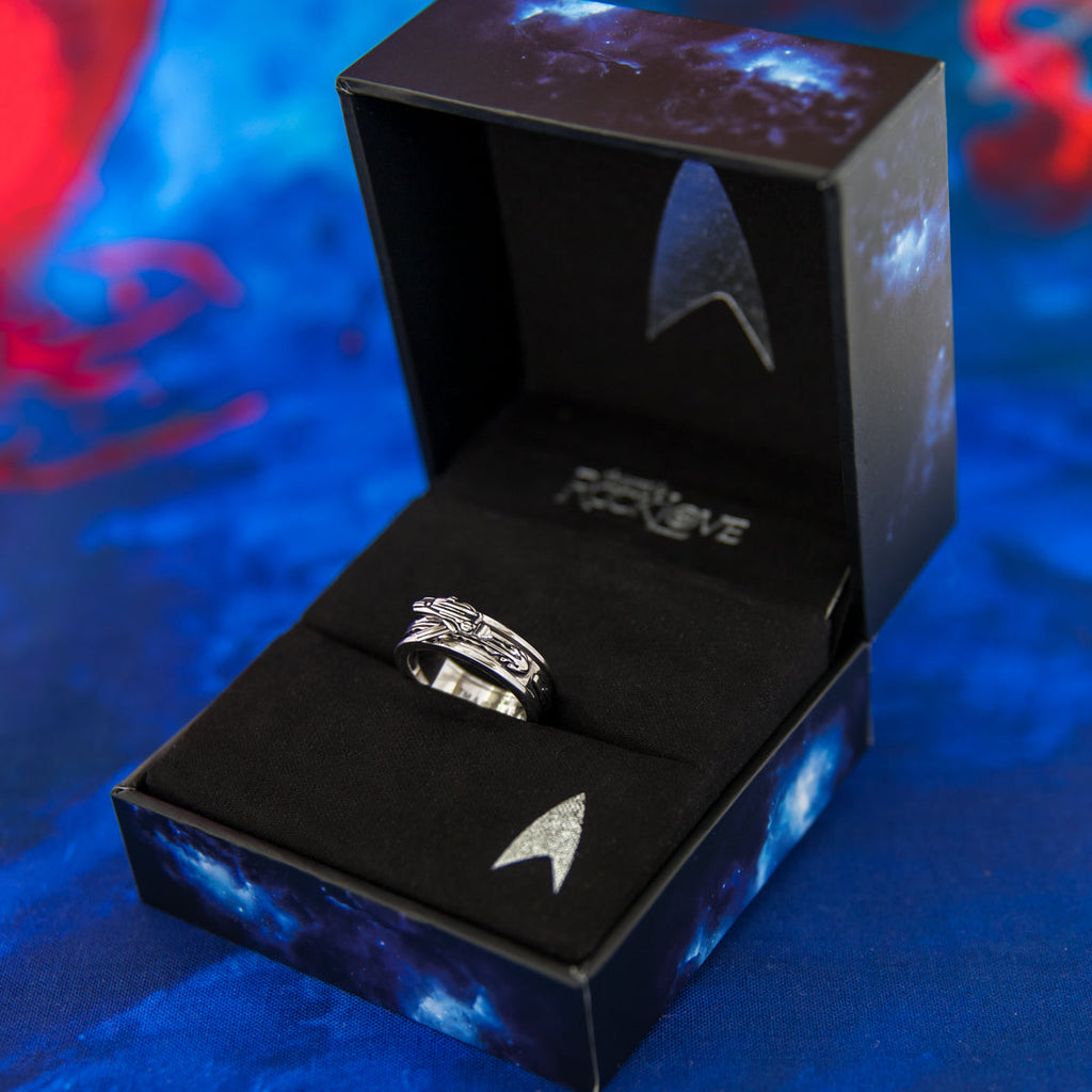 Every piece of Star Trek | RockLove jewelry arrives in a signature Star Trek | RockLove Jewelry Box featuring black and silver metallic with vibrant blue galaxy print.