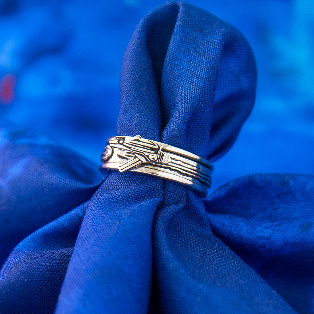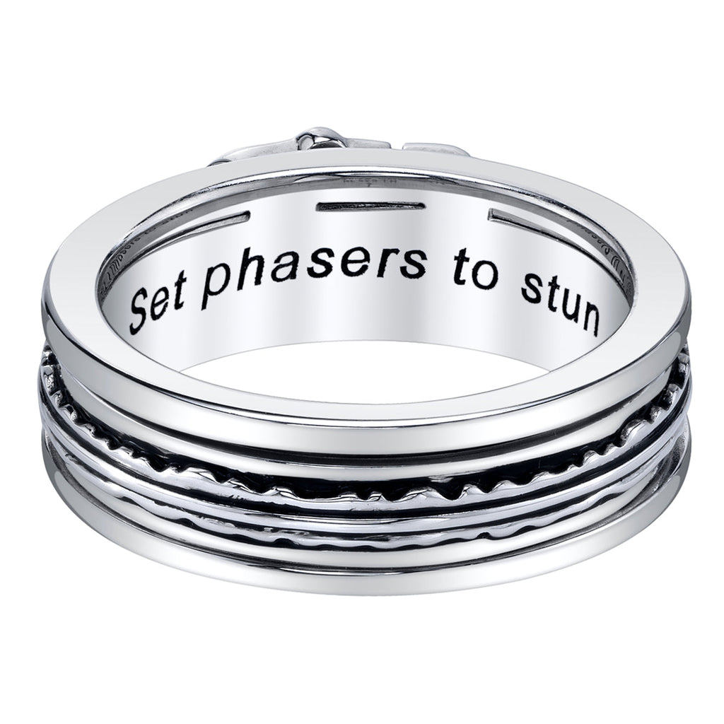 Handcrafted in solid sterling silver, the Phaser Spinner Ring is the ultimate accessory for any Trek fan! Inspired by Star Trek™: The Original Series, this ring features a sculpted phaser that remains stationary at the top, with an interior ring band set beneath it. As the inner band revolves, it creates the illusion of a spinning beam of energy. Inside the ring, the engraved command “Set phasers to stun” reflects the show's ethos of prioritizing exploration and diplomacy over aggression.