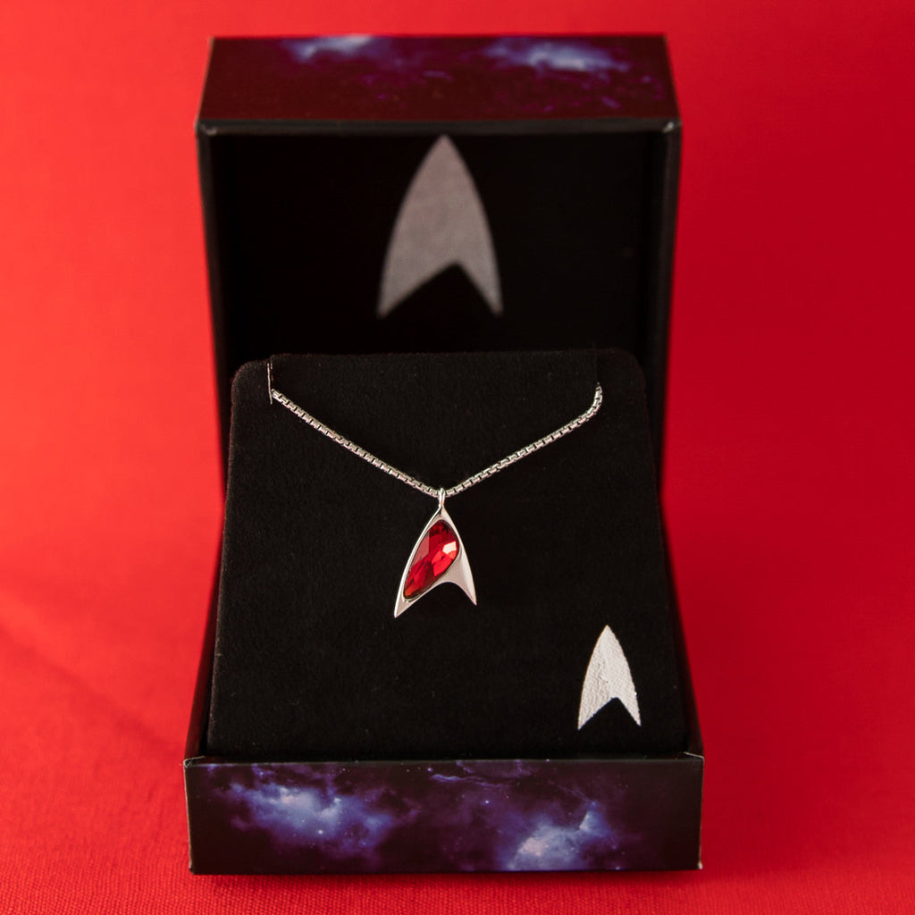 Handcrafted in sterling silver, a custom faceted vibrant garnet red cubic zirconia crystal is set within a sleek sculpted setting. Engraved with the Star Trek logo on the reverse, the Crystal Delta Pendant hangs from a unisex 20 inch nickel-free sterling rounded box chain with signature tag.