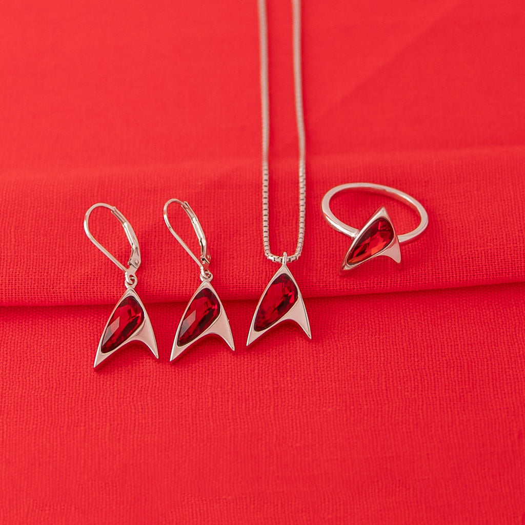 Handcrafted in sterling silver, a custom faceted vibrant garnet red cubic zirconia crystal is set within a sleek sculpted setting. Engraved with the Star Trek logo on the reverse, the Crystal Delta Ring melds into a subtle rounded nickel-free sterling band, available in an array of sizes.