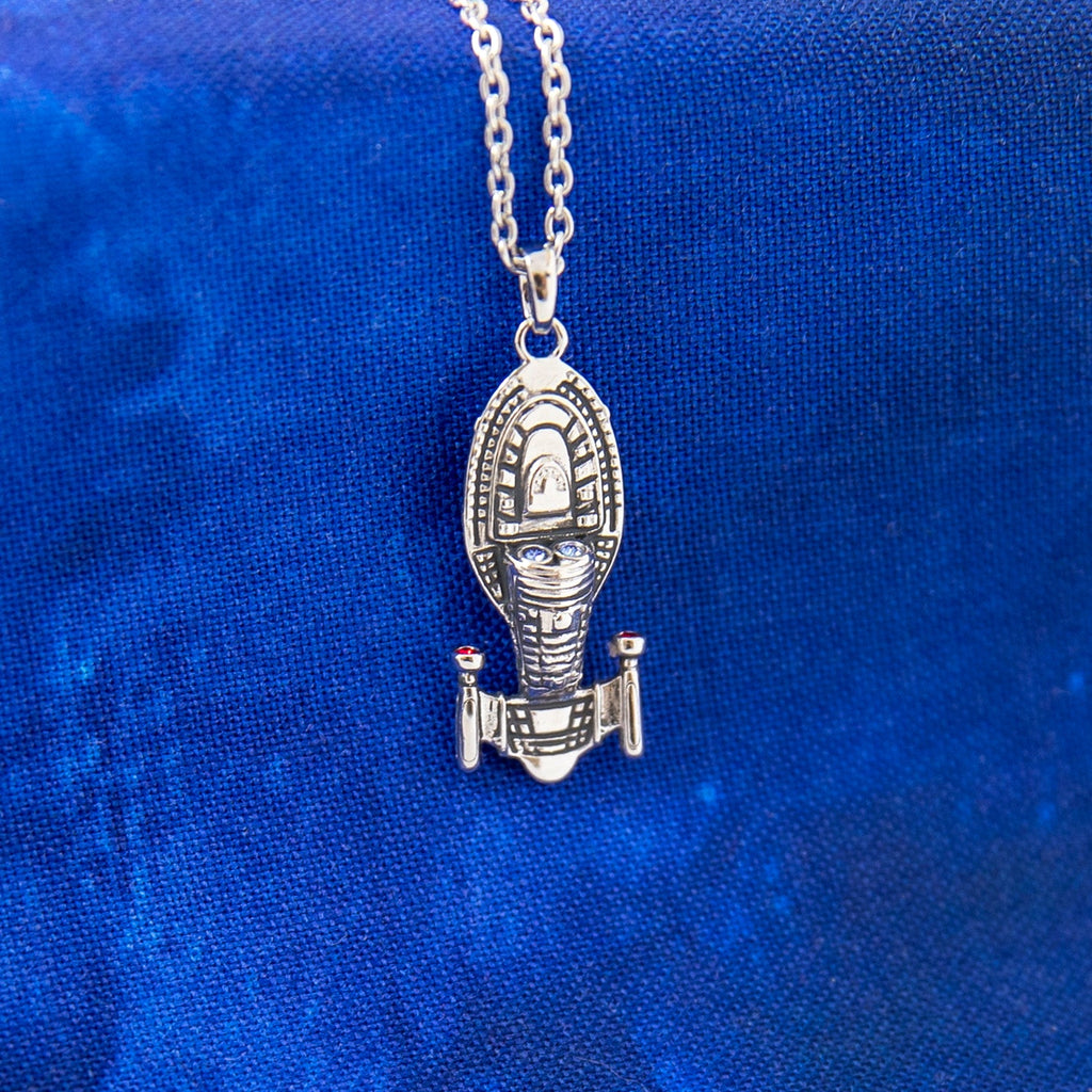 Accentuated with two garnet red cubic zirconia crystals set into the warp nacelles, along with sapphire blue crystals emulating the glow of the navigational deflector, this piece blends stylish elegance with a profound homage to the sci-fi legacy. The pendant hangs from an adjustable sterling silver cable chain complete with a lobster clasp and signature tag