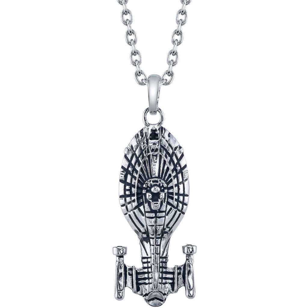 Lost in unchartered space, the U.S.S. Voyager embodies Star fleet's spirit of exploration, alliance and perseverance while struggling to return home. Handcrafted in antiqued sterling silver, this meticulously detailed three-dimensional miniature U.S.S. Voyager Starship Necklace captures the essence of its iconic design from Star Trek™: Voyager.