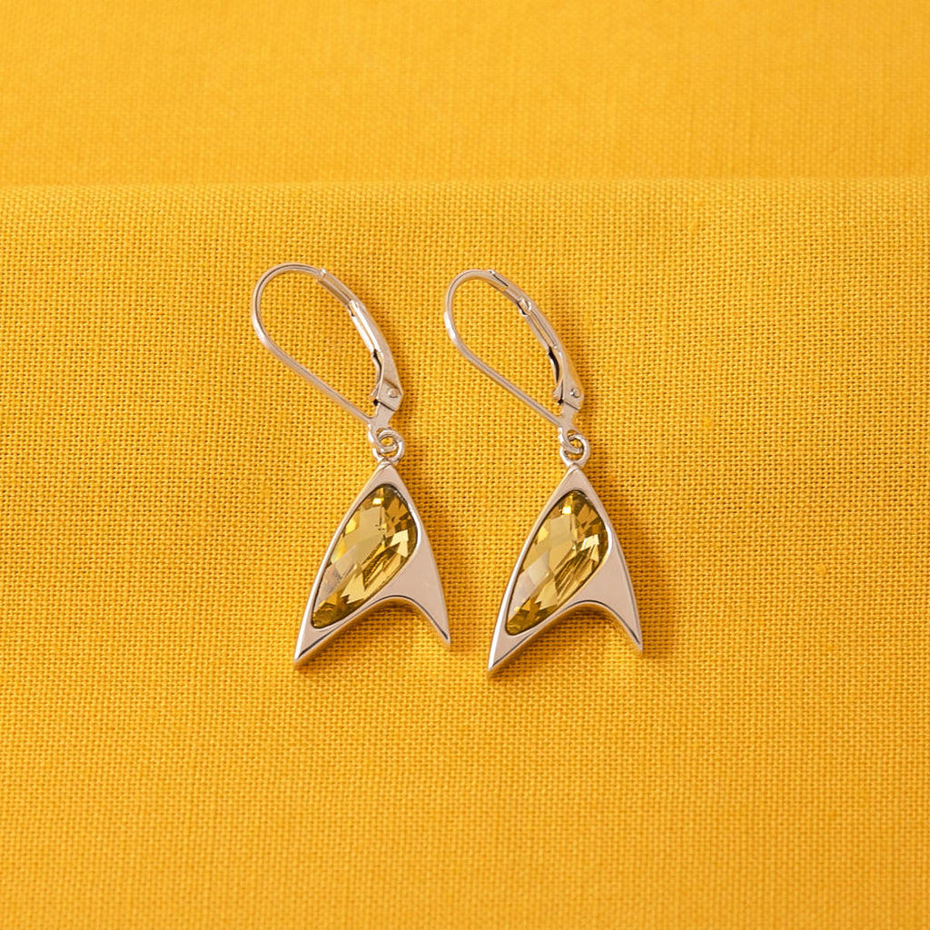 Handcrafted in sterling silver, custom faceted vibrant citrine yellow cubic zirconia crystals are set within sleek sculpted settings. Engraved with the Star Trek logo on the reverse, the Crystal Delta Earrings hang from subtle and secure nickel-free sterling silver leverback components.