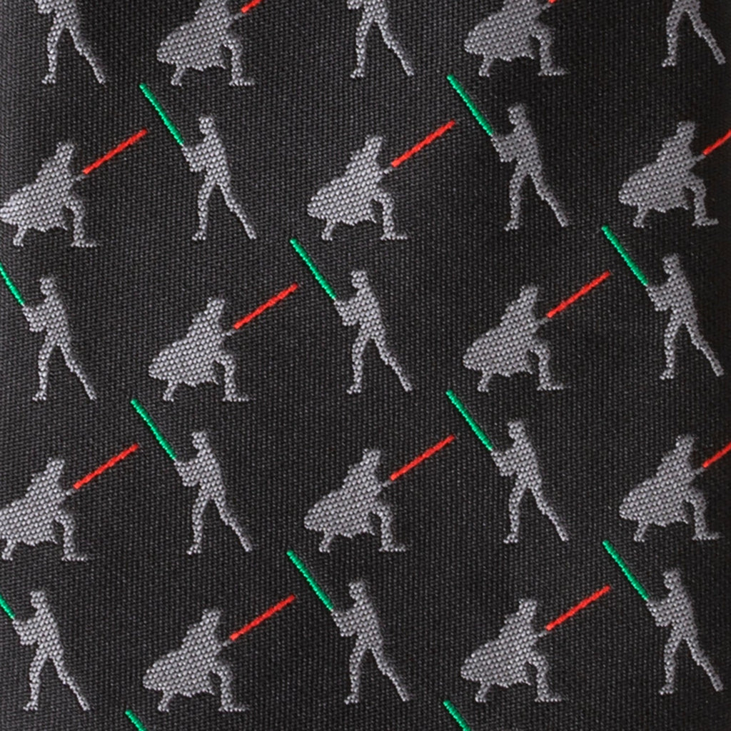 A legendary battle between the forces of good and evil play out on this black tie. The green lightsaber of the Jedi, wielded by Luke, and the red lightsaber of the Sith, wielded by Darth Vader, pop off the tie as if the fight is happening in front of you. This tie will maintain its shape and hold a perfect knot thanks to the durable yet stylish100% Polyester. Pairs perfectly with our Vader V. Luke Socks or matching Jedi or Sith products. Officially licensed by LucasFilm LTD.