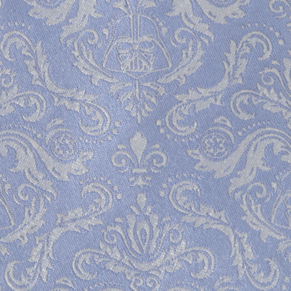 Who says fandom has to be noisy? Enjoy the finer things in life with this sophisticated 100% silk china blue tie. Elegant feather and leaf scrolls form a pattern around Darth Vader's helmet, and small Imperial icons unfurl neatly to finish the look. Officially licensed by Lucasfilm LTD.