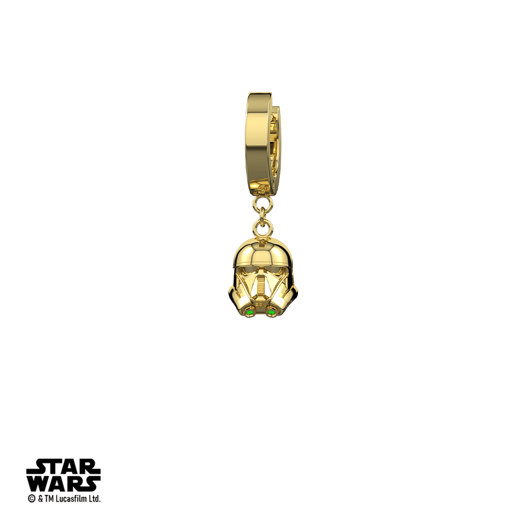 The Death Trooper Earring has a hinged hoop earring (20 GA) made from high-grade Stainless Steel. Features a 3D-style Death Trooper pendant at 1/2" tall x 3/8" wide.