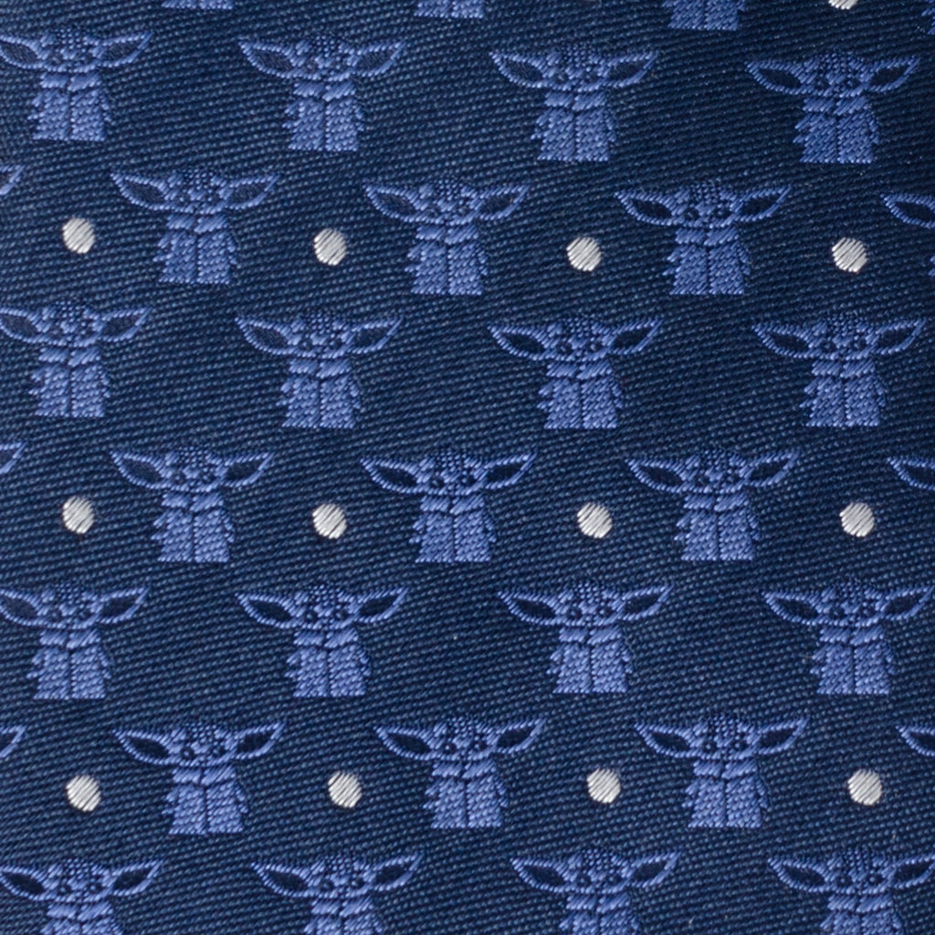 Our Grogu Navy Blue Men's Tie features rows of light blue Grogu motifs, better known as The Child or Baby Yoda, stitched on a blue silk base. White pin dots compliment and brighten the design of the tie, creating a dot pattern. Experience the Way of the Mandalore with our expertly crafted Silk Blend tie. It's built to withstand the challenges of bounty hunting across the galaxy, infused with the honor of Mandalorian creed, and ready to accompany you on interstellar hunts. Pairs well with our Grogu Cut Out Tie Bar. Officially licensed by LucasFilm LTD.