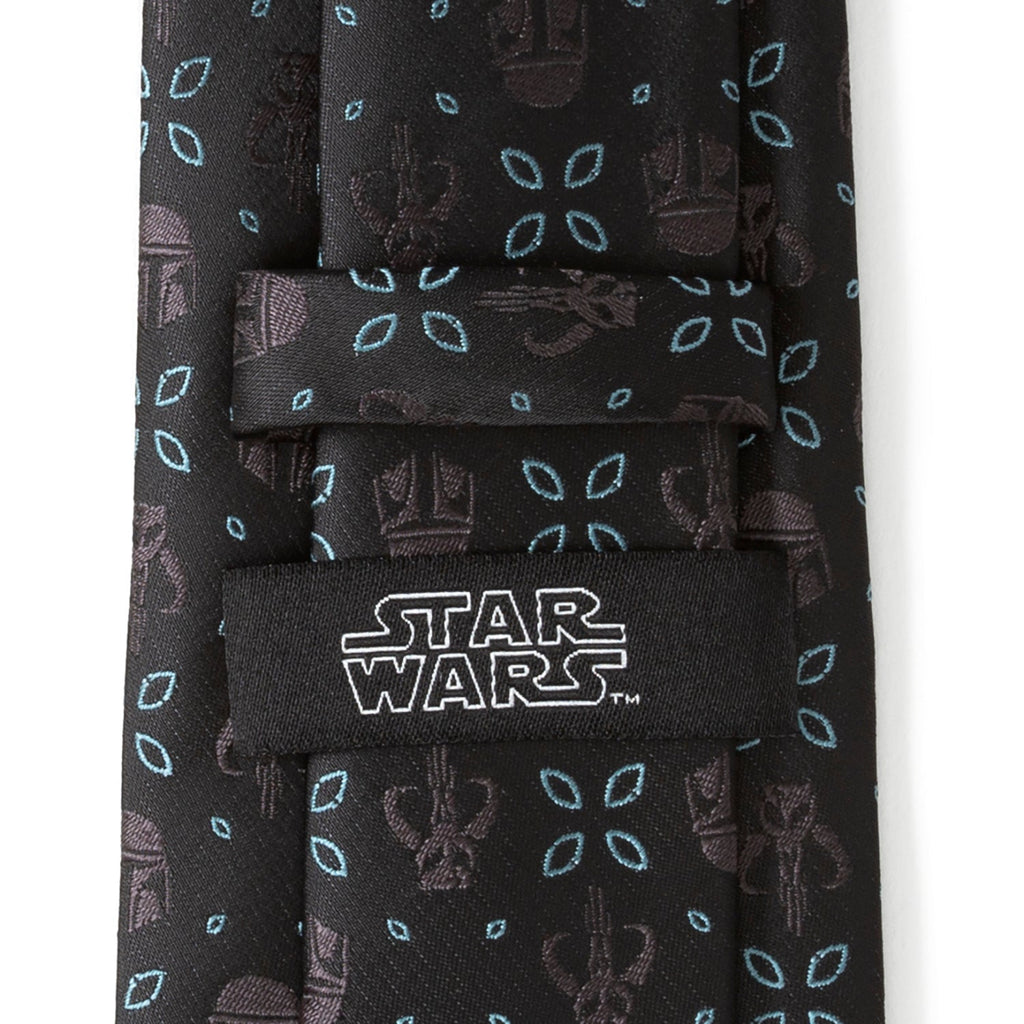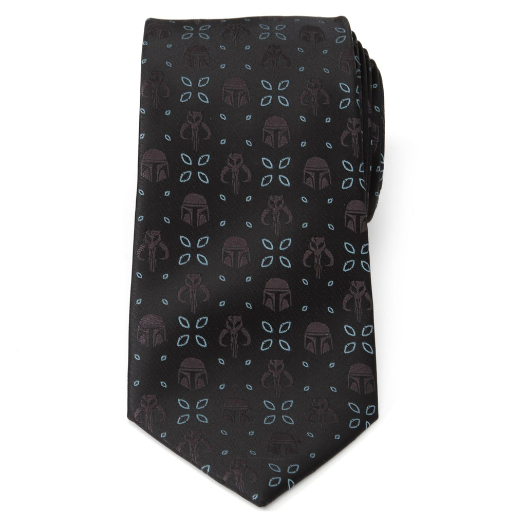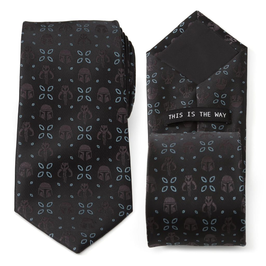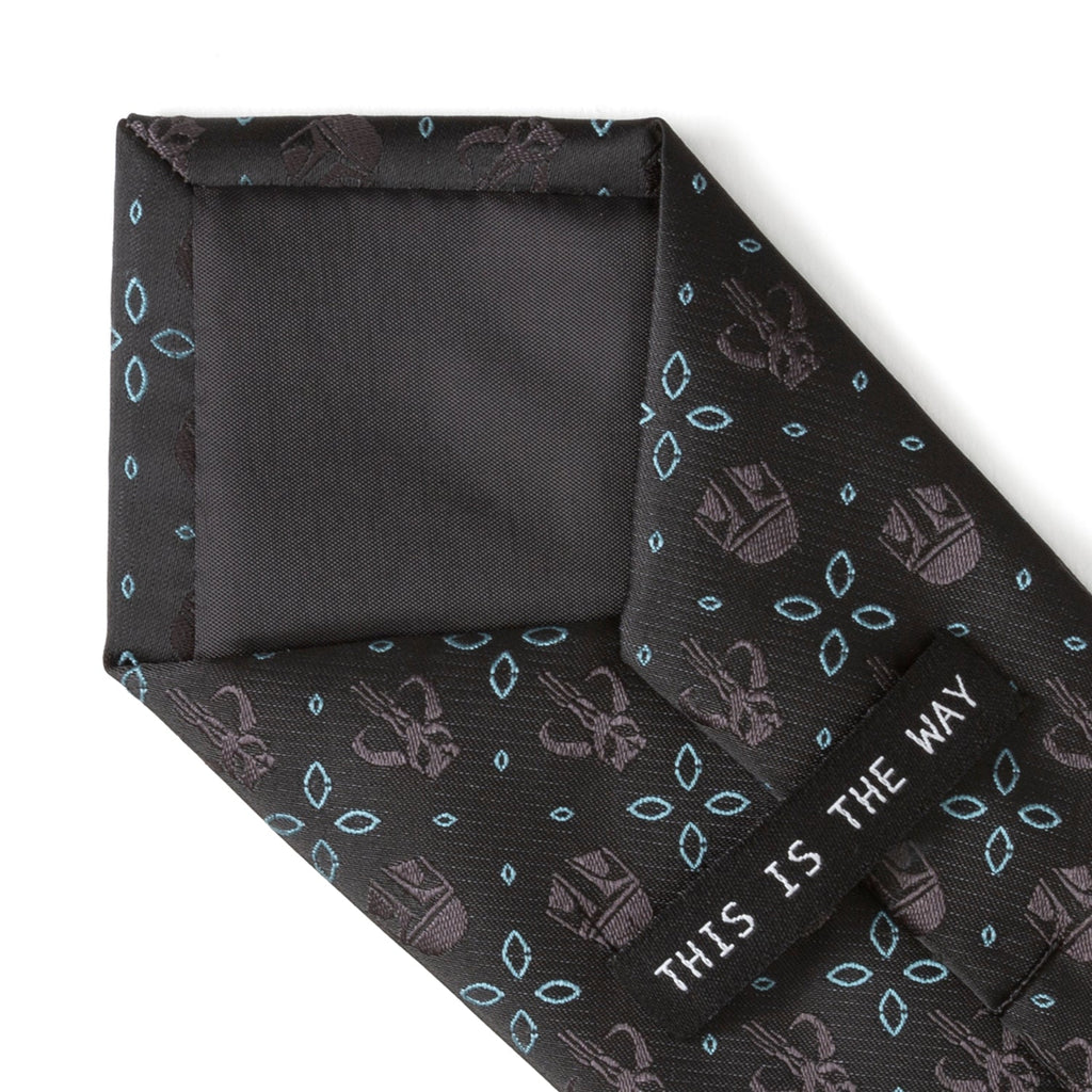 Designed with rows of Mandalor helmets and Mythosaur skulls, our Madalorian Motif Black Tie is a new addition to our Mandalorian collection. Set on a smooth black base, the motifs stitched in black are enhanced by electric blue floral accents to create a classy design. Our tie will maintain its shape and hold a sturdy knot thanks to the durable yet stylish 100% Polyester. Pairs well with our Mandalorian Cufflinks. Officially licensed by Lucasfilm LTD.