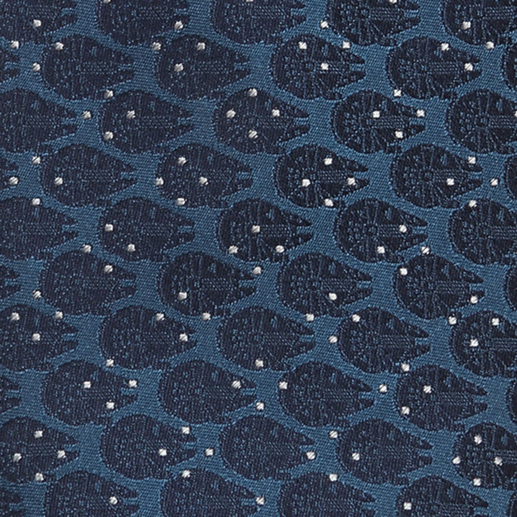 A blend of sophisticated yet nerdy, this tie will be a conversation starter among colleagues and fellow fans. Navy millennium falcon motifs blend into the navy base, creating a tonal effect. Gray pin dots, reminiscent of the stars, add a traditional pattern to the subtle design. Our tie will maintain its shape and hold a perfect knot thanks to the durable yet soft 100% Silk. Officially licensed by Lucasfilm LTD.