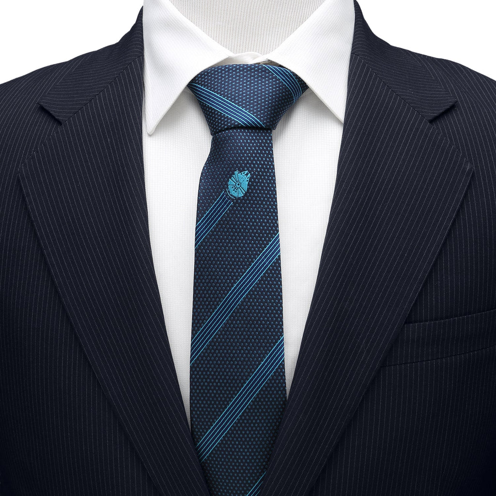 Make a statement in this clever azure blue and navy striped tie. While most ties will hide the logo when a suit jacket is buttoned up, our unique design ensures the flying Millennium Falcon icon remains front and center, even when the occasion calls for buttons. Enjoy the feel of 100% silk and turn your tie over to locate an embroidered logo. Officially licensed by Lucasfilm LTD.