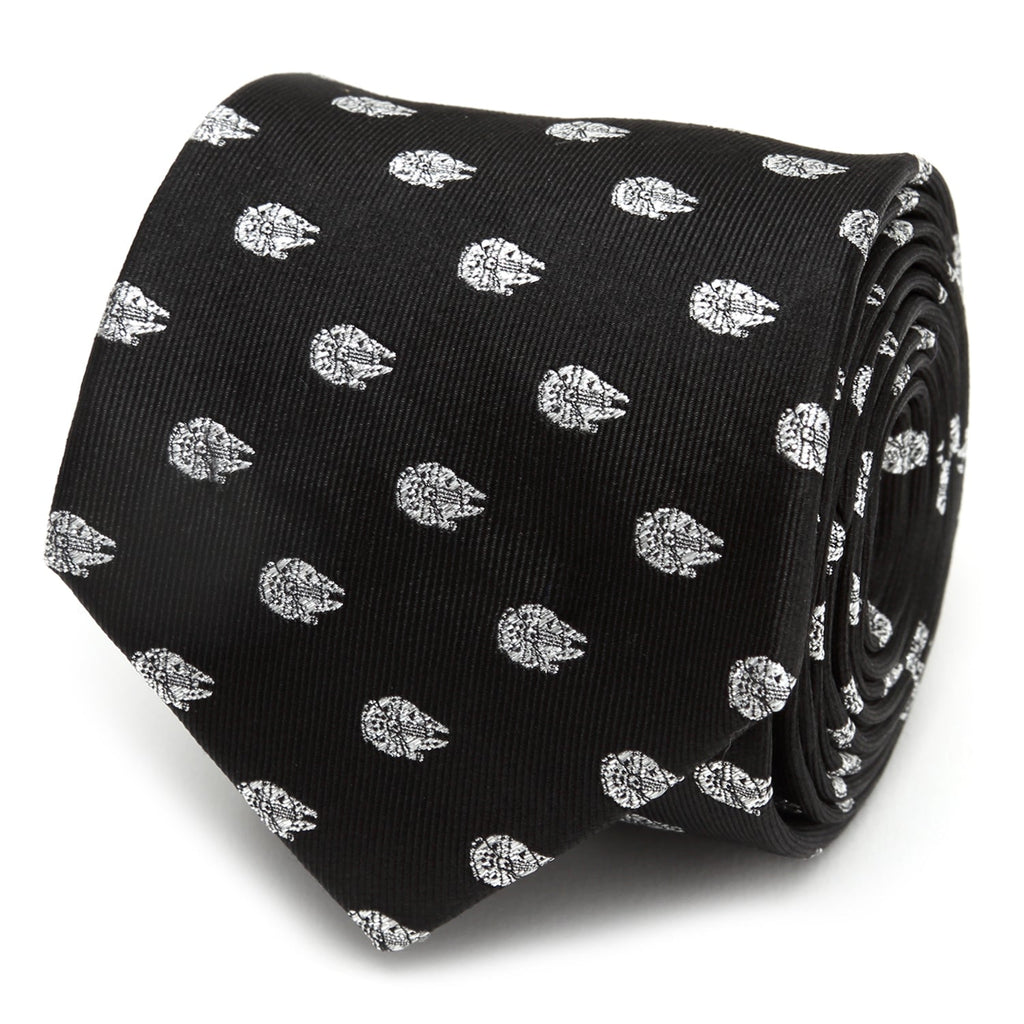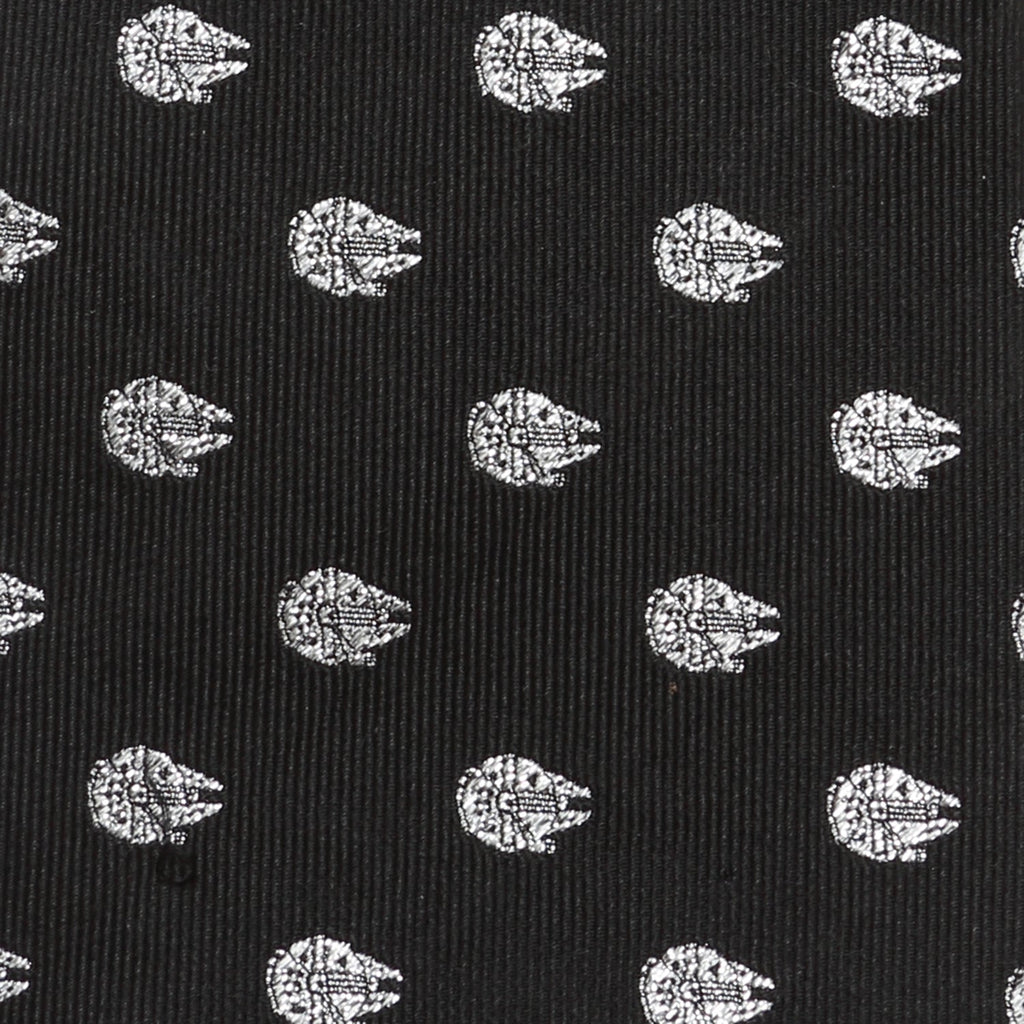 The metallic silver thread in this beautiful 100% silk tie sets off a series of Millennium Falcon icons like sparkling stars against an endless black sky. It's the perfect way to show off your love of all things Star Wars. Officially licensed by Lucasfilm LTD.
