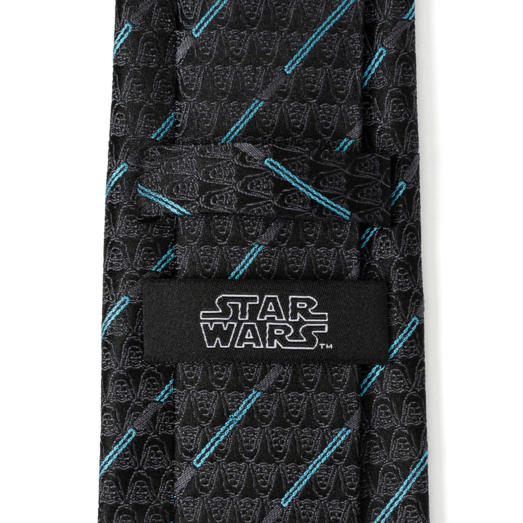 Our Obi-Wan Kenobi Saber Men's Tie utilizes Obi Wan Kenobi's lightsaber to form a blue diagonal stripe pattern on a black ground. The black background features a tight repeated tonal pattern of Obi Wan's cloaked head. Join Obi Wan and the Jedi against the Dark Side without compromising your style. Experience the Force with our expertly crafted 100% Silk tie. It's built to withstand the tests of galactic events, infused with Jedi wisdom, and ready to accompany you on interstellar missions. Officially licensed by LucasFilm LTD.