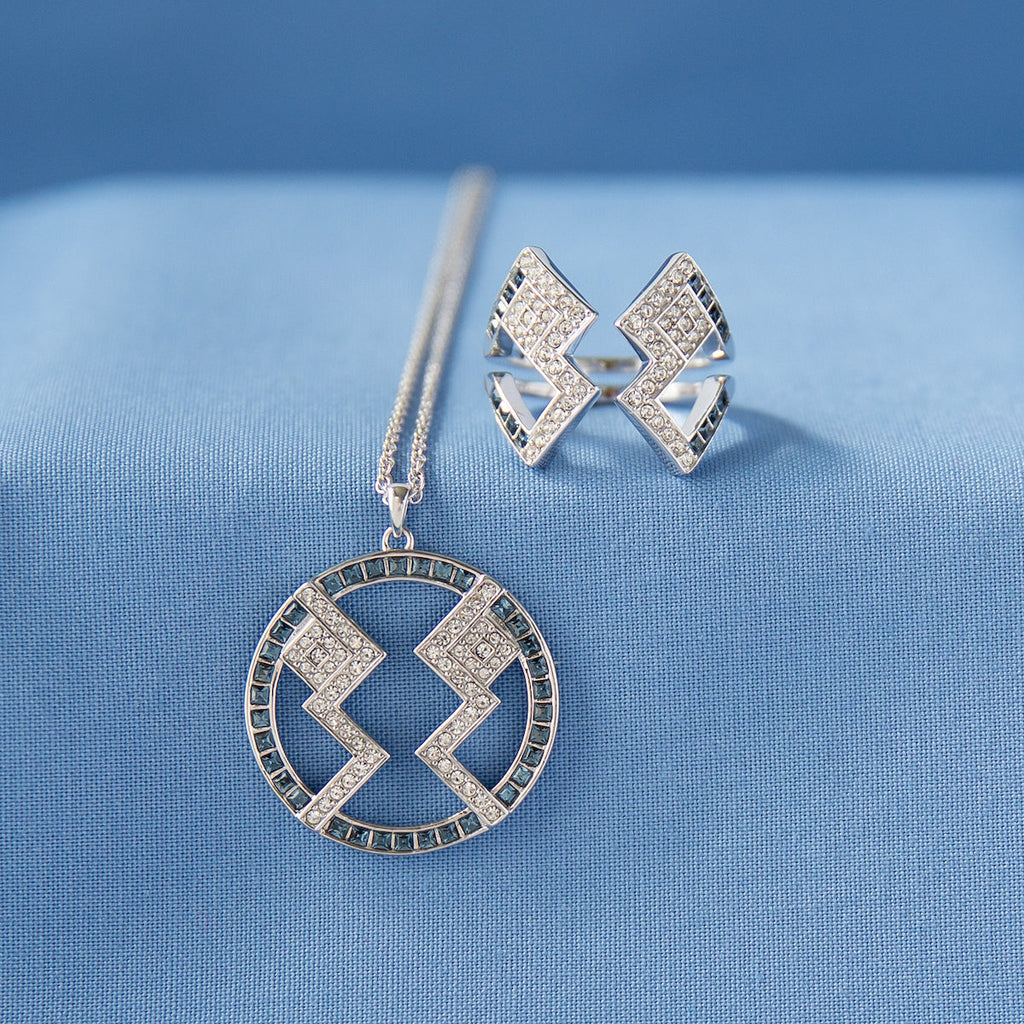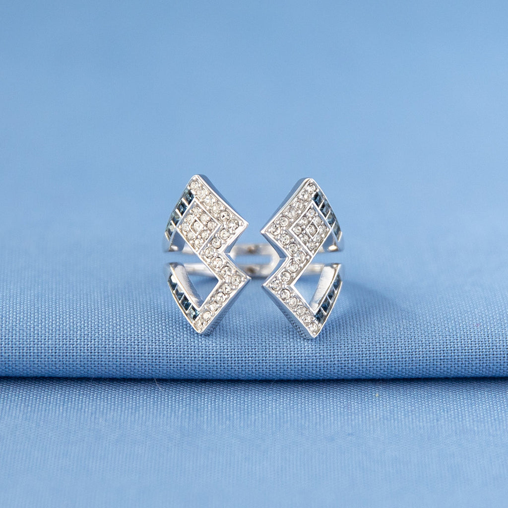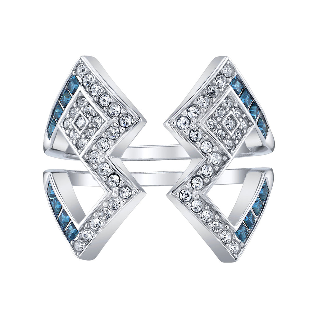Handcrafted in solid sterling silver and featuring nearly seventy glittering crystals, the AHSOKA TANO Crystal Ring depicts the TOGRUTA’s unique face markings in a subtle, stylish cutout silhouette. An open-style ring in polished silver, Ahsoka’s forehead pattern is enhanced by white brilliant-cut cubic zirconia, which are then bordered by denim blue faceted square crystals. The sophisticated ring is slightly adjustable, with the tapered sides wrapping as twin bands around the underside of the finger.
