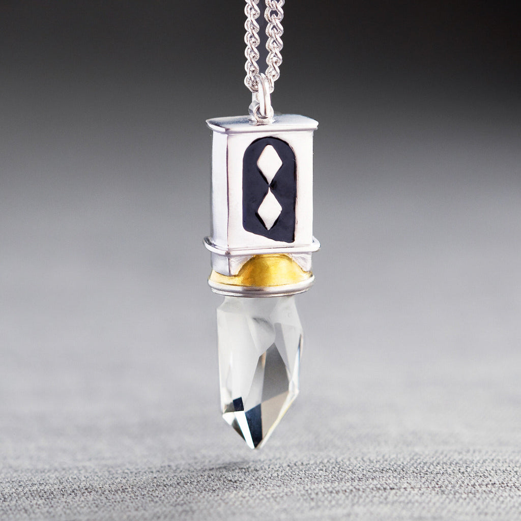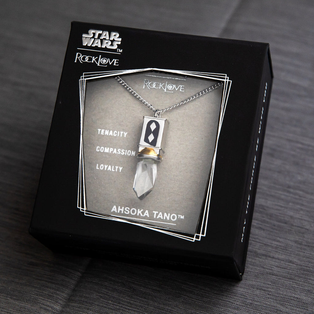 The Ahsoka Tano Kyber Crystal Necklace is handcrafted from start to finish. The personal weapons of AHSOKA TANO, her second pair of LIGHTSABERS, this curved-hilt set consists of one regular saber and a shoto Lightsaber, both with white blades. Ahsoka was the PADAWAN learner to ANAKIN SKYWALKER and a hero of THE CLONE WARS. Alongside Anakin, she grew from headstrong student into a mature leader. But her destiny laid along a different path than the Jedi. Cast in artisan brass, plated in silver and 14K yellow gold, the pendant is sculpted after Ahsoka Tano’s Lightsabers featuring the diamond hilt design accented by hand painted black enamel. Cradled within the metal structure, a transparent white crystal reflects your relationship inspired by THE FORCE.