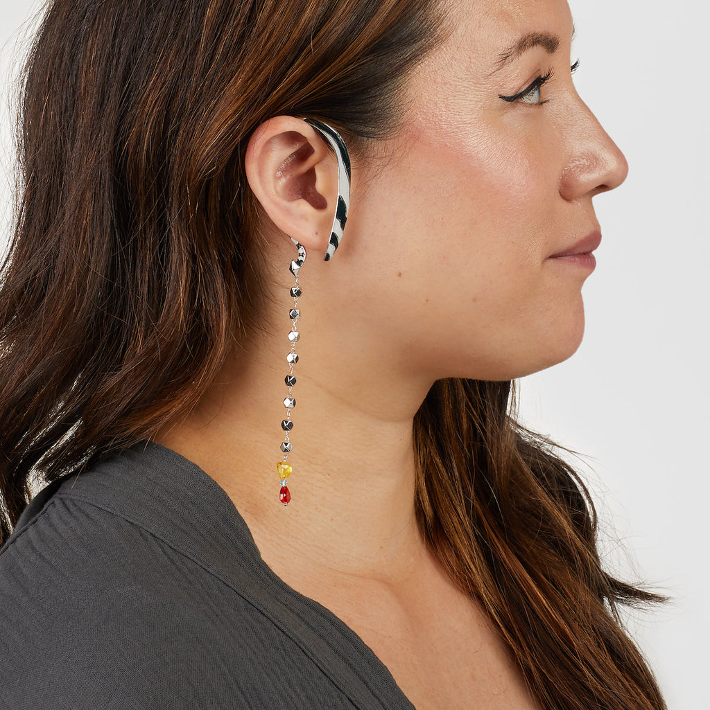 Handcrafted by individually linking alternating shapes of silver plated brass beads, the drop features colorful round and triangular cubic zirconia crystals, emulating the distinctive design of Ahsoka’s own beads.