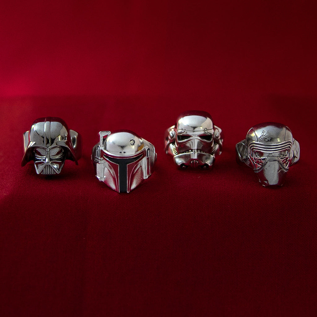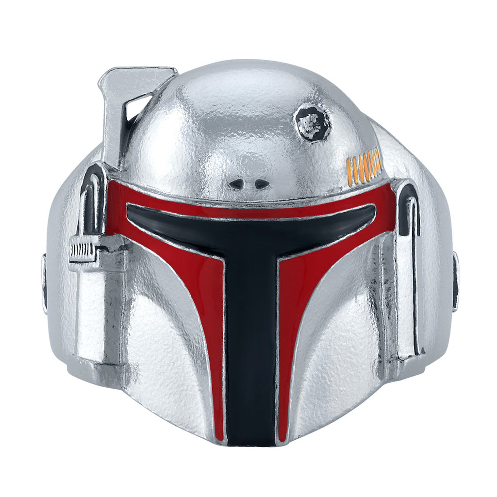Handcrafted in sterling silver and antiqued for contrast, the unisex BOBA FETT Helmet Ring depicts the helmet of the galaxy’s most iconic bounty hunter. Enhanced with hand painted enamel details, the ring features Boba Fett’s helmet and sculpted along the band in raised lettering: "BOUNTY HUNTER.” Three-dimensional, the domed helmet is hollowed beneath to be lightweight and comfortable for everyday wear.