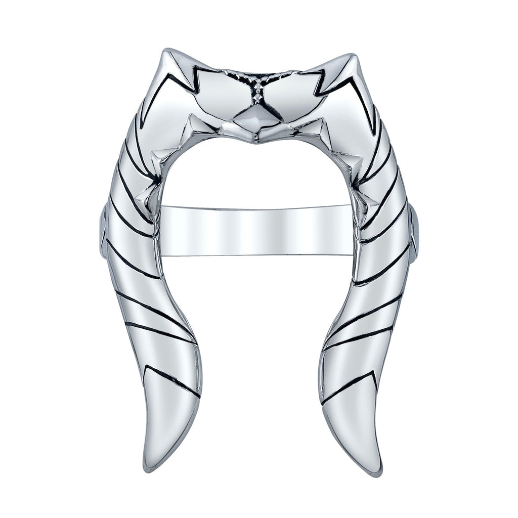Handcrafted in solid nickel-free sterling silver and antiqued for contrast, the brightly polished CLONE WARS AHSOKA TANO Montral Ring is an homage to the courageous and head-strong Ahsoka Tano from STAR WARS: THE CLONE WARS. Featuring young Ahsoka’s iconic silhouette with LEKKU that frame the finger, the ring depicts her JEDI PADAWAN headdress with AKUL TEETH and SILKA BEAD details. Ahsoka’s intricate montral pattern is faithfully etched on all surfaces, including the underside of the ring, and continuing across the band.