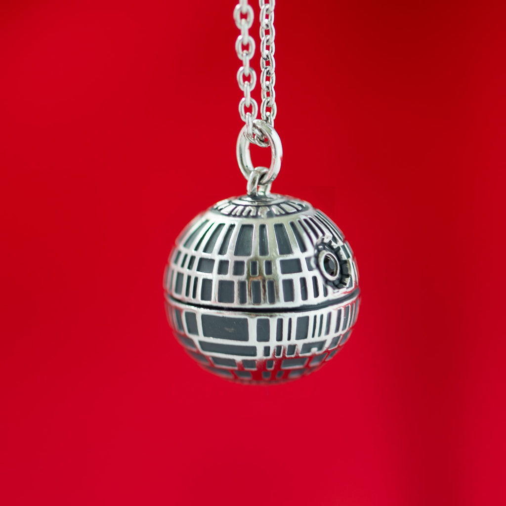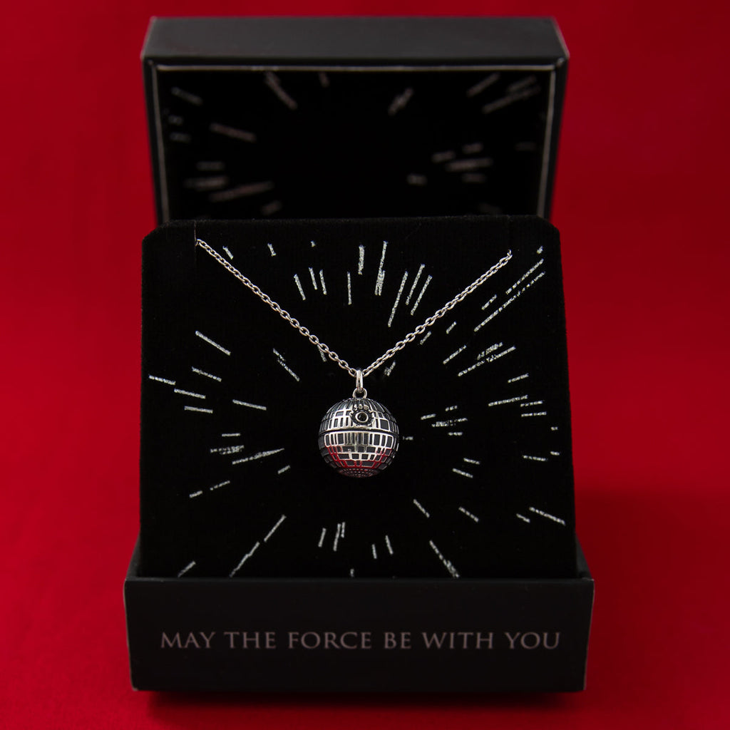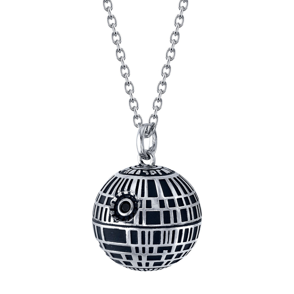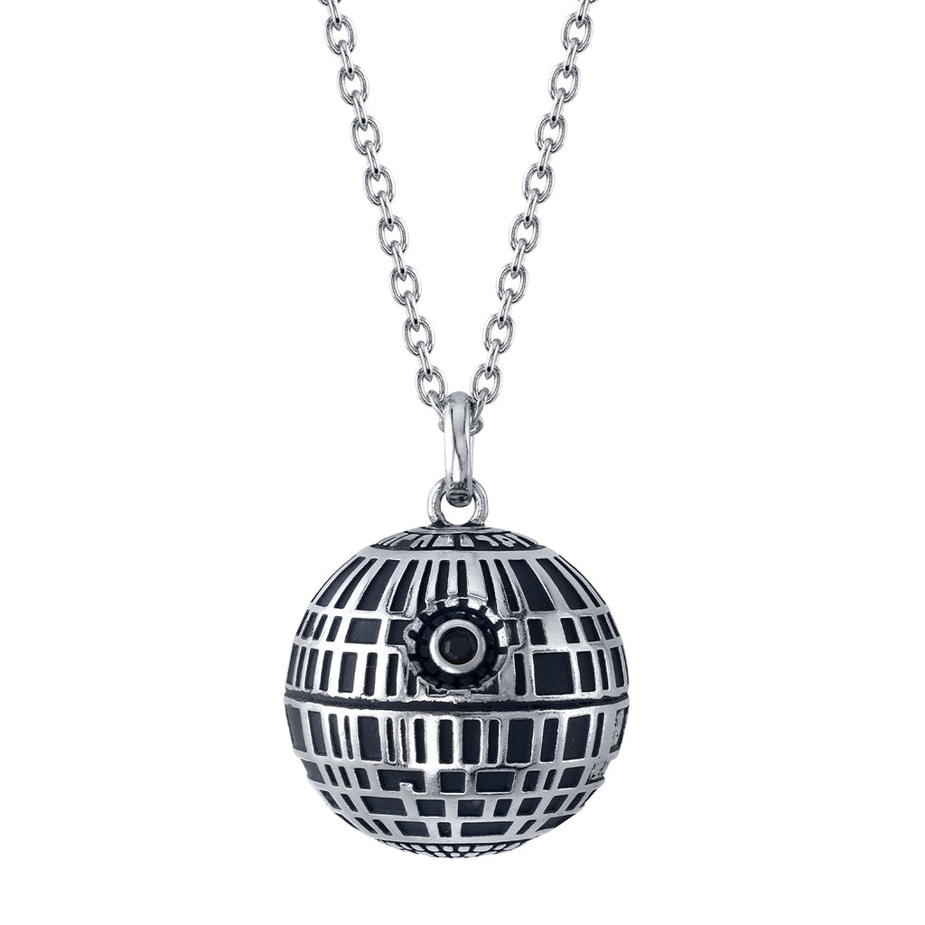 The DEATH STAR was the EMPIRE’S ultimate weapon: a moon-sized space station with the ability to destroy an entire planet. Handcrafted in antiqued sterling silver and realistically sculpted in ominous miniature, the intricately detailed three-dimensional Death Star inspired necklace is blackened for dramatic contrast and features a gleaming jet black cubic zirconia crystal representing the SUPERLASER focus lens. The pendant hangs from an adjustable sterling silver cable chain with signature tag.