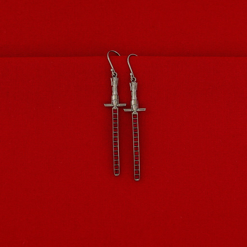 BEN SOLO was seduced by the dark side of the Force and renamed himself KYLO REN. The conflicted warrior embodied the struggle between the dark side and the light. Handcrafted in sterling silver, plated in polished black rhodium, the earring Lightsaber blades feature glittering red square-cut Austrian crystals. The earrings hang from matching black rhodium plated nickel-free sterling silver French wires.