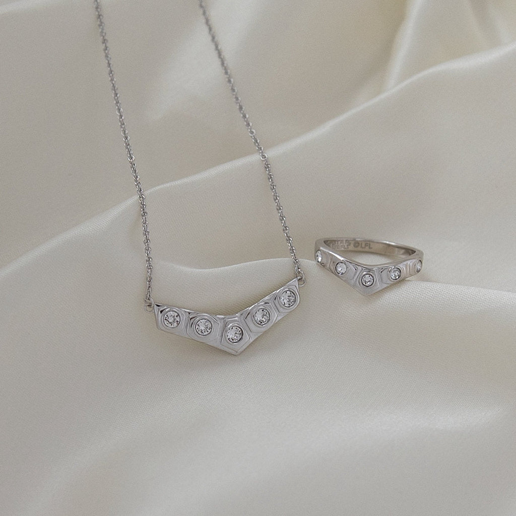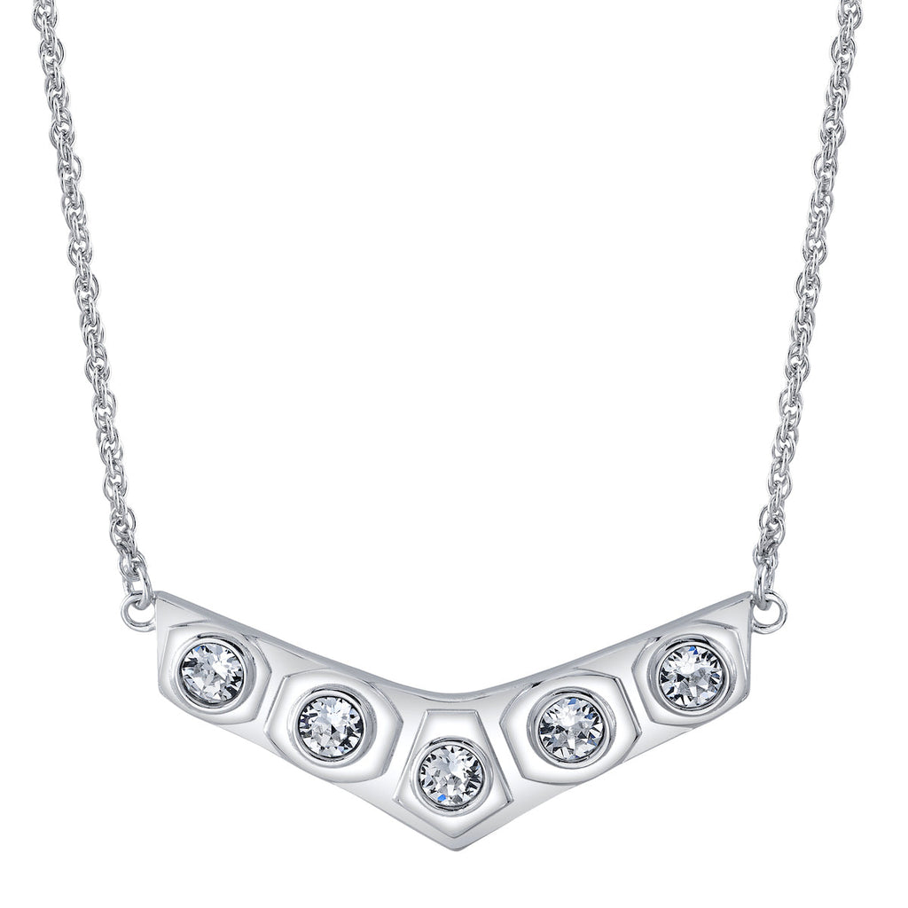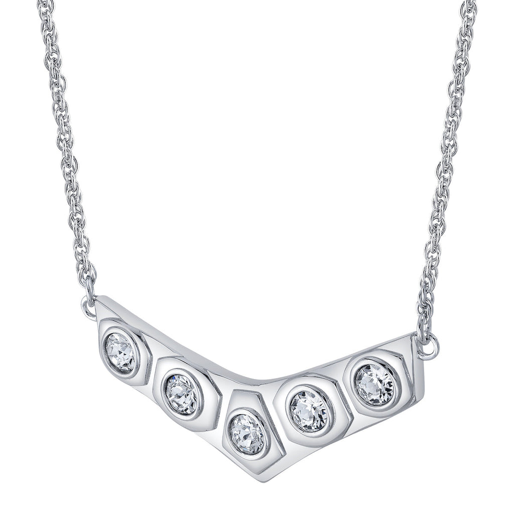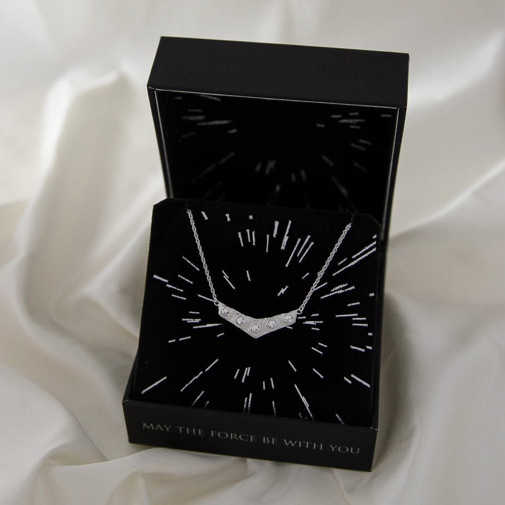 Handcrafted in solid sterling silver, the LEIA ORGANA Crystal Necklace is inspired by PRINCESS LEIA’s legendary white gown seen on-screen in the Royal Award Ceremony. Five large white brilliant-cut faceted cubic zirconia crystals are bezel set within polished sculpted stations, emulating the pattern on her iconic belt. Suspended between two lengths of adjustable sterling rope chain complete with elegant extender weight, the V-shaped necklace is a sophisticated and subtle homage to the self-saving princess.