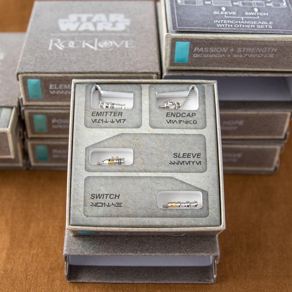 This STAR WARS™ | RockLove piece arrives in a specialized LIGHTSABER™ Workshop Collector's Box, inspired by the stackable drawers and compartments of a galactic architect’s workshop. Molded compartments protect the unassembled hilt components and includes a matching branded luxury travel pouch.