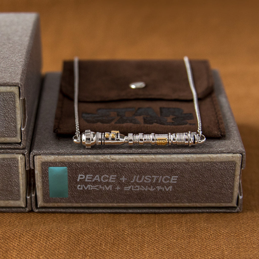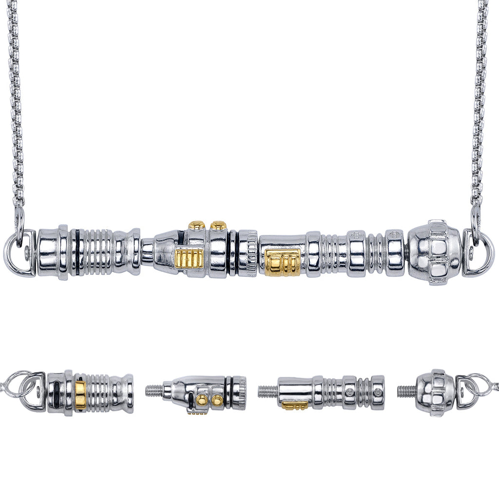 Threaded screws secure each hilt component in place for simple and secure assembly, while also ensuring your LIGHTSABER™ necklace is a complete build: only a sleeve can fit into an emitter, a switch into a sleeve, and so on. The necklace is finished with swiveling D-rings attached to a white rhodium-plated rounded box chain, ensuring ease of wear.