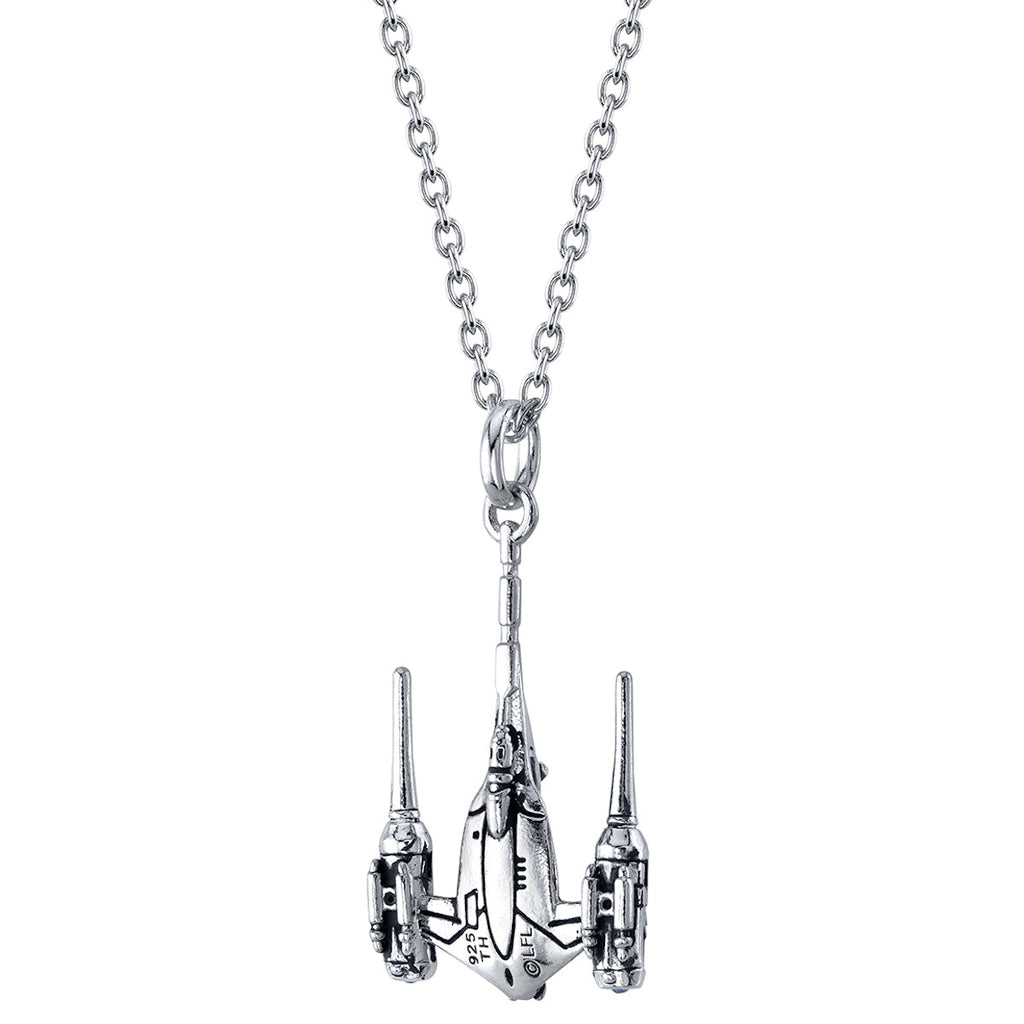 Protecting the skies and space around NABOO is the N-1 STARFIGHTER. Its sleek design exemplifies the philosophy of art and function witnessed throughout Naboo technology. Handcrafted in antiqued sterling silver and realistically sculpted in sleek miniature, the intricately detailed three-dimensional N-1 Starfighter inspired necklace features two glittering light blue cubic zirconia crystals set within each engine thruster. The pendant hangs from an adjustable sterling silver cable chain with signature tag.