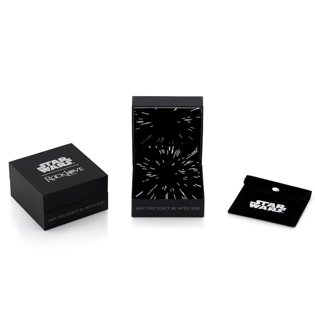 This STAR WARS | RockLove jewelry design is Limited Edition. Every STAR WARS | RockLove piece arrives in a signature STAR WARS | RockLove Collector's Box, with embossed exterior and metallic silkscreened art inside. The two fitted pieces stack, with the jewelry mounted in a theatrical wide screen proscenium: a compelling addition to any display case.