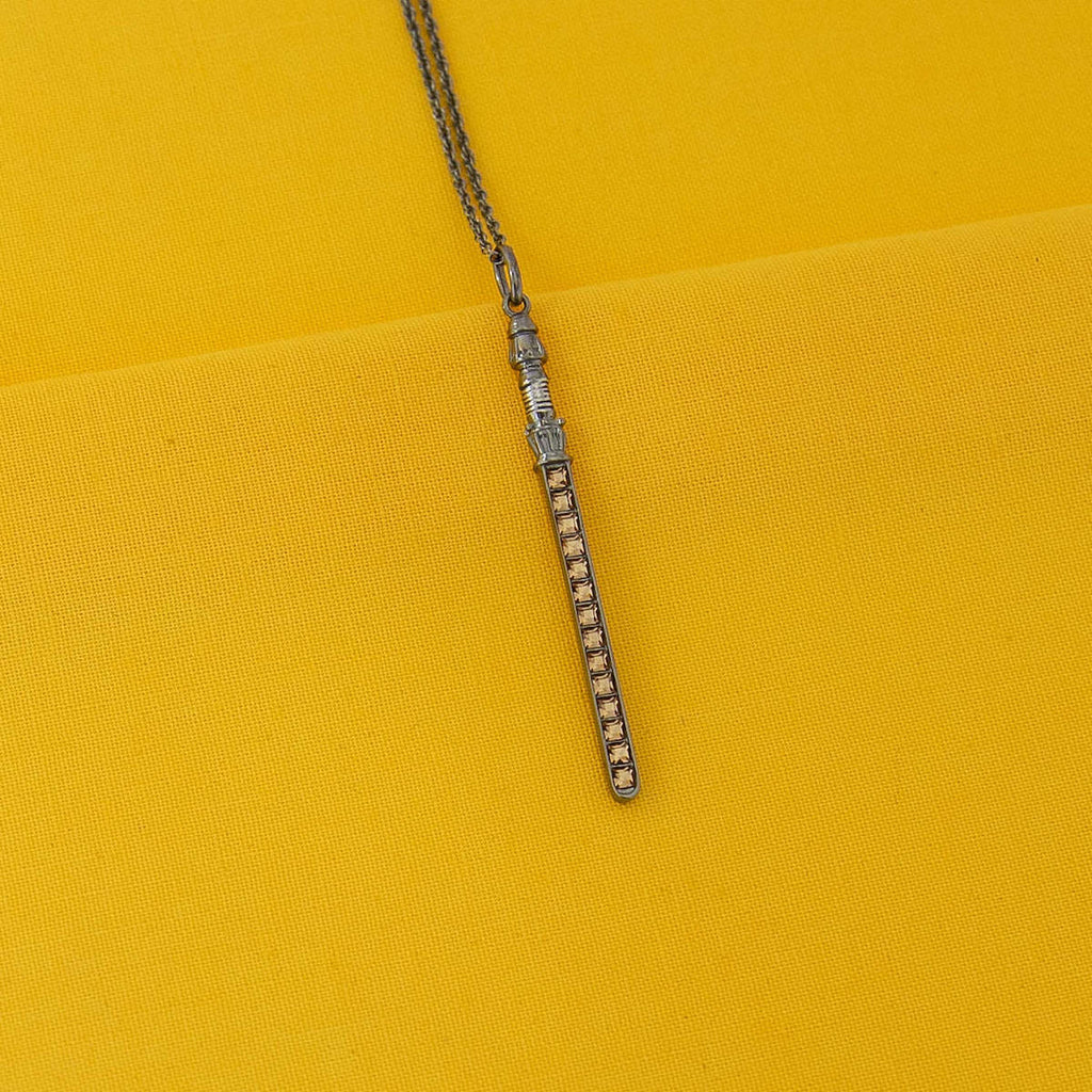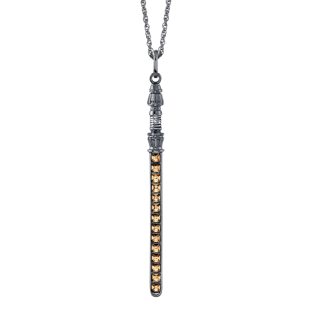 Powerful in the Force, REY is the self-discovering hero of the latest STAR WARS Trilogy. Handcrafted in sterling silver, plated in polished black rhodium, the necklace Lightsaber blade features glittering topaz square-cut Austrian crystals. The pendant hangs from an adjustable sterling silver rope chain with signature tag and graceful extender weight.