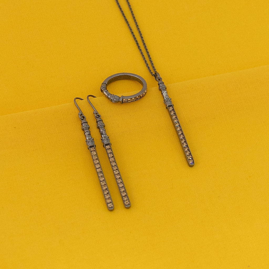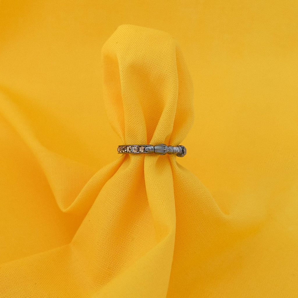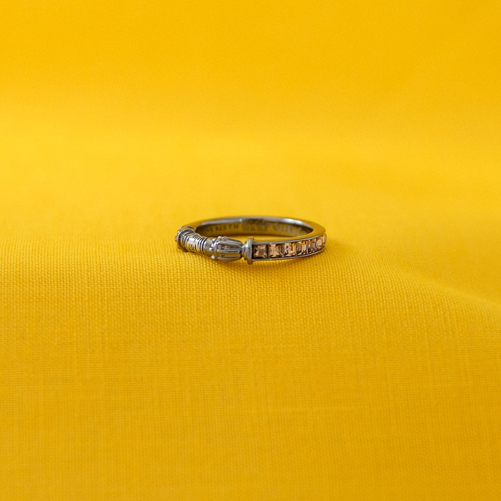 Powerful in the Force, REY is the self-discovering hero of the latest STAR WARS Trilogy. Handcrafted in sterling silver, plated in polished black rhodium, the ring Lightsaber blade features glittering topaz square-cut Austrian crystals and wraps uninterrupted around the finger.