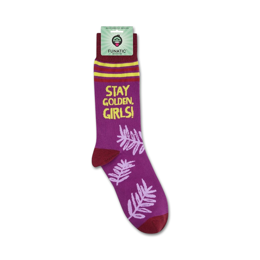 Stay Golden, Girls! These purple crew socks with bold yellow lettering and a palm leaf pattern on the back are perfect for fans of the classic TV show. Whether you're sipping coffee at home or strutting down the street, these socks will remind you to stay positive and embrace your inner Golden Girl. Fun fact: Betty White, who played Rose Nylund on the show, was the first woman to win an Emmy for Outstanding Continuing Performance by an Actress in a Comedy Series. She was also the longest-running female cast member on Saturday Night Live, appearing on the show for 10 seasons. So if you're looking for a pair of socks that are as funny and fabulous as the Golden Girls themselves, these are the socks for you!