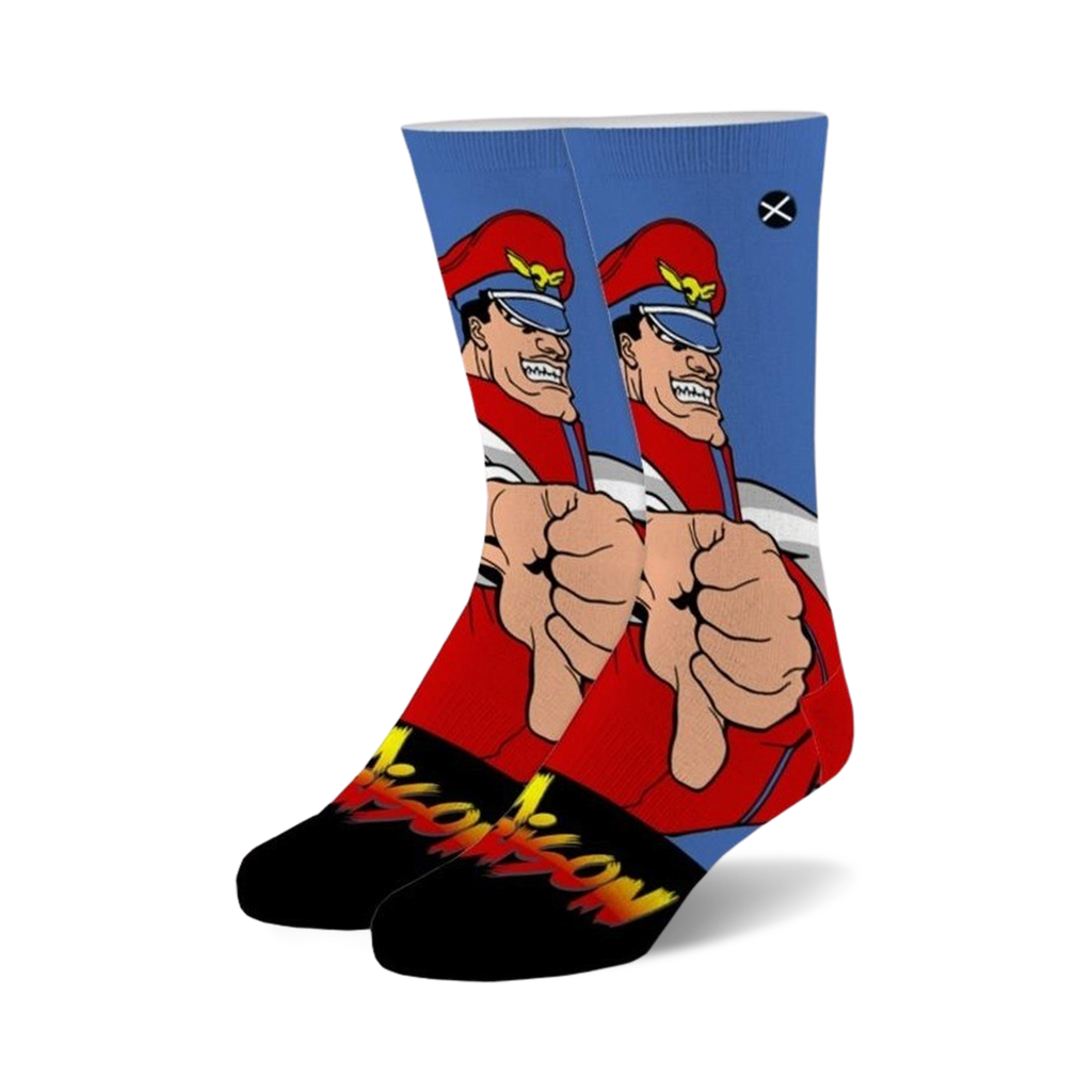 These socks are so cool, even M. Bison would wear them! In deep red, blue, and black, this pair of crew length socks features an awesome pattern of M. Bison from the Street Fighter series, complete with his signature red military cap and gloves. Whether you're a gamer, a fashionista, or just someone who wants to add some fun to their sock drawer, these are the perfect kicks for you. So go ahead, grab a pair and show the world that you're a true Street Fighter fan.