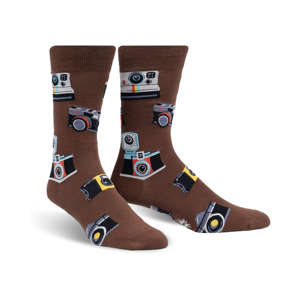 Strike a Pose with Style! These vintage camera-printed crew socks are sure to turn you into the star of the show. With their brown background and vibrant pattern of classic cameras, these socks will make you the center of attention wherever you go.