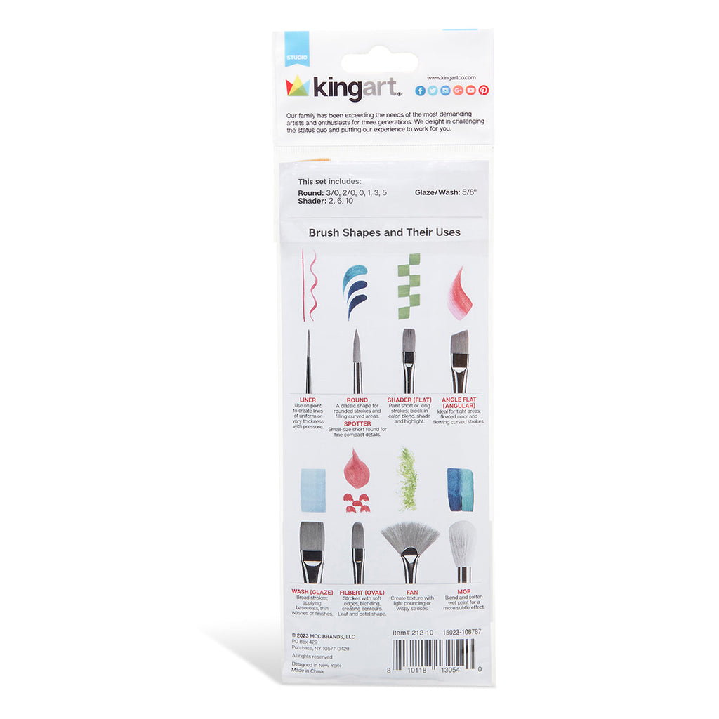 • Versatile brush shapes include liner, shader, filbert, angle, fan, and mop (reference chart included on back of packaging)