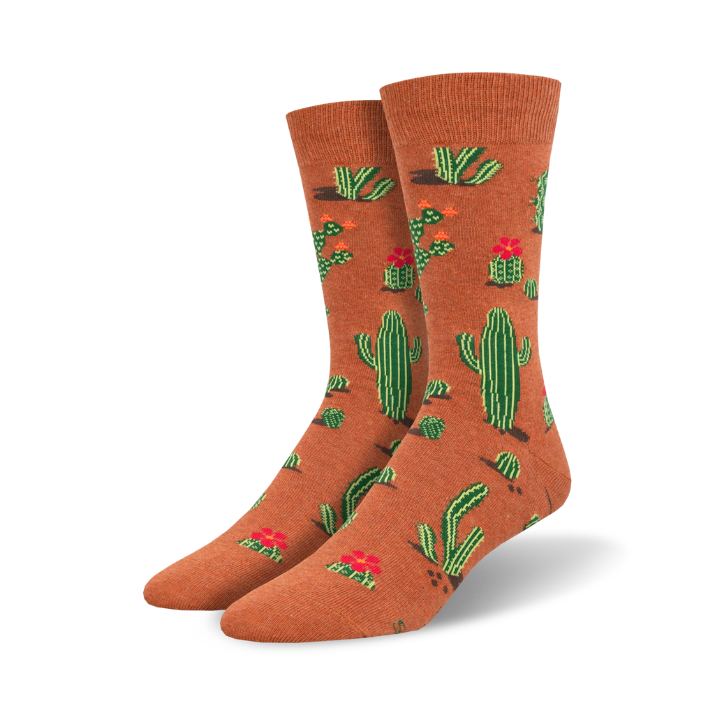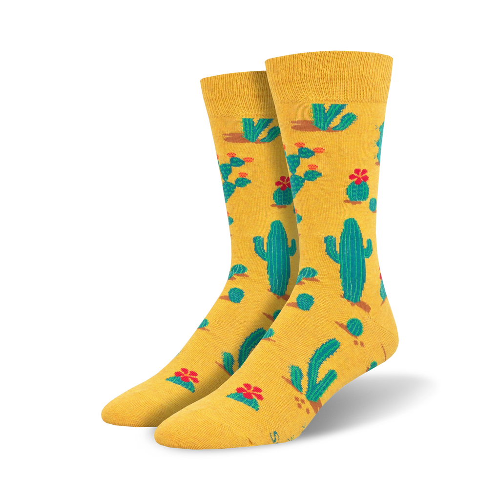 Prick up your feet with these Succ It Up Cactus socks that'll make your soles the center of attention. Don't be a prick and miss out on these unique, eye-catching socks featuring a pattern of green cacti and vibrant red flowers against a cheerful yellow background. Whether you're hitting the town or just lounging at home, these crew-length socks will add a touch of fun to your look. Plus, with their reinforced toe and heel, these socks are as durable as a cactus in the desert! Show off your love for nature and stand tall with these blooming beauties on your feet.