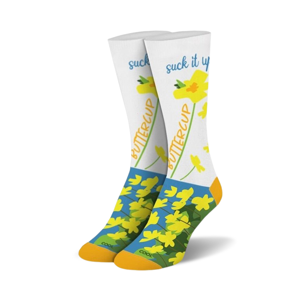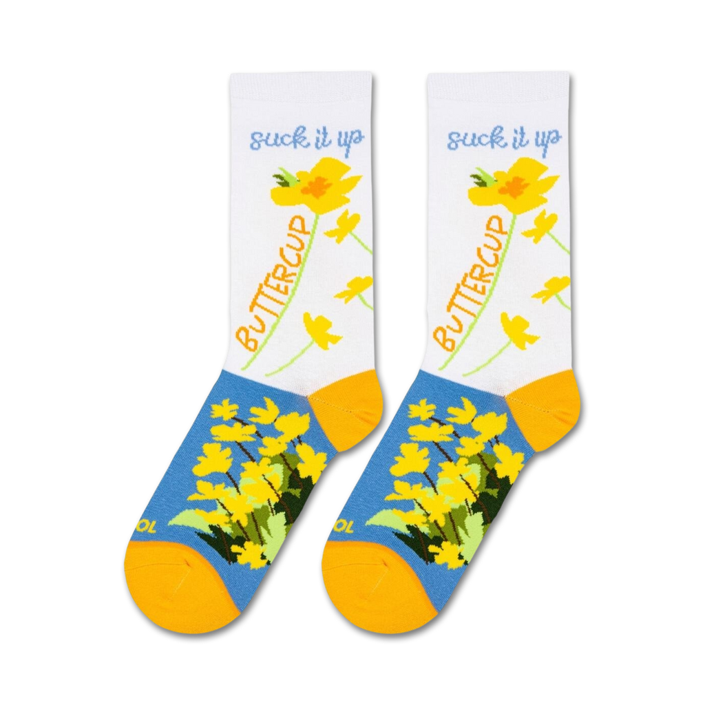 Yellow buttercups dance across these sassy white socks, while a bright blue and yellow Suck it Up Buttercup  serves as a cheeky reminder to get back up after life knocks you down. Because, as the song goes, Everything's gonna be alright!  Step into these cheerful crew socks to stomp out negativity and anxiety wherever you go.