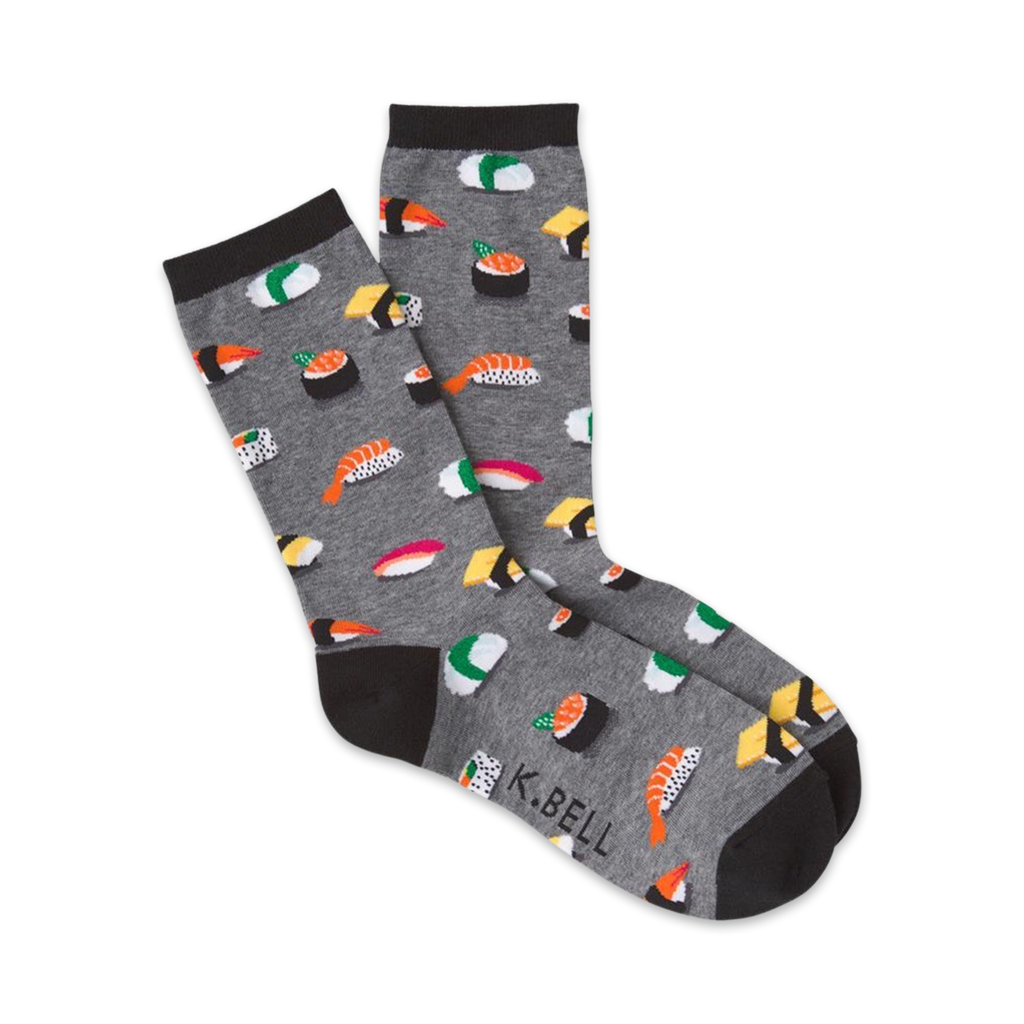 Sushi Socks: Dig In! These crew socks in gray feature a delectable array of sushi favorites, including nigiri, maki, and sashimi. Crafted from soft cotton, with a black toe and heel for an extra dash of style, these socks are the perfect feast for your feet. Fun fact: Did you know that sushi was once considered a fast food in Japan?